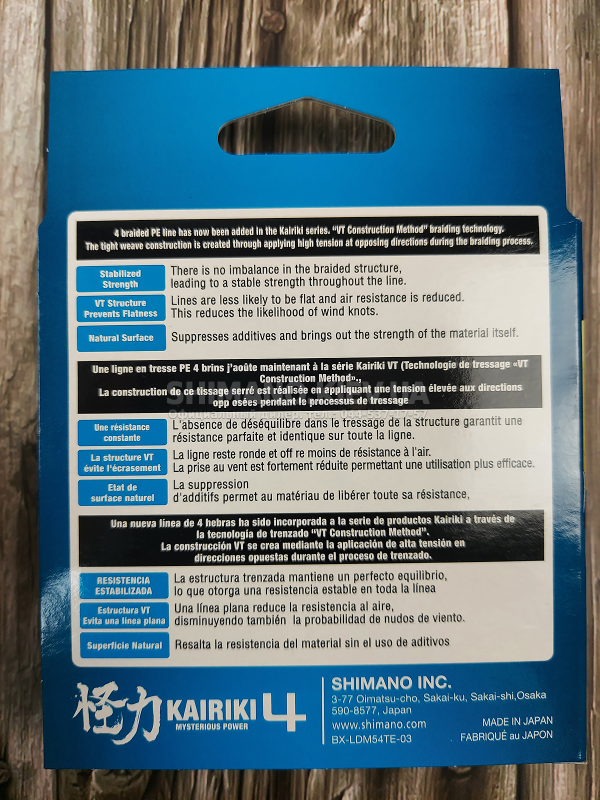 Японська плетінка розрахована на універсальну рибалку - Kairiki 4 PE має помірні показники жорсткості, затребувані варіанти діаметрів і стійке комбіноване забарвлення, яке покращує візуальне сприйняття процесу ведення приманки та клювання риби. Технологія Enhanced Body Technology створює досить щільний характер плетіння волокон шнура і зберігає свою структуру під впливом абразиву завдяки наявності покриття, що підвищує стійкість до пошкоджень.