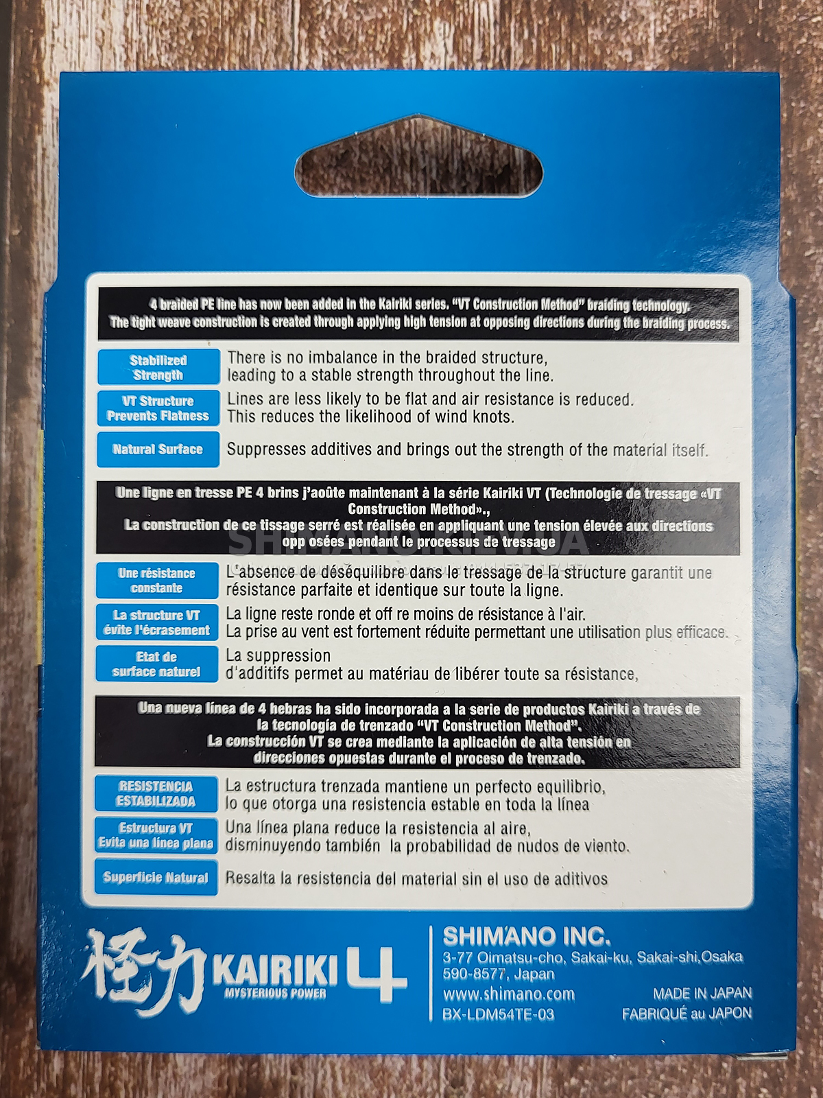 Японська плетінка розрахована на універсальну рибалку - Kairiki 4 PE має помірні показники жорсткості, затребувані варіанти діаметрів і стійке комбіноване забарвлення, яке покращує візуальне сприйняття процесу ведення приманки та клювання риби. Технологія Enhanced Body Technology створює досить щільний характер плетіння волокон шнура і зберігає свою структуру під впливом абразиву завдяки наявності покриття, що підвищує стійкість до пошкоджень.