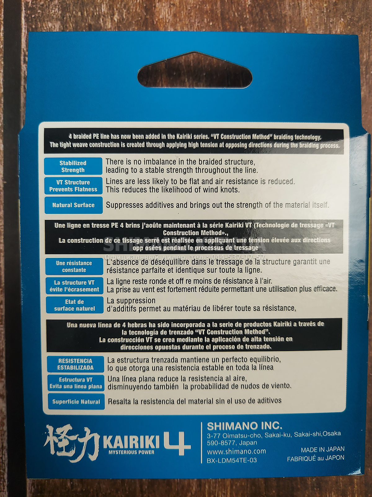 Японська плетінка розрахована на універсальну рибалку - Kairiki 4 PE має помірні показники жорсткості, затребувані варіанти діаметрів і стійке комбіноване забарвлення, яке покращує візуальне сприйняття процесу ведення приманки та клювання риби. Технологія Enhanced Body Technology створює досить щільний характер плетіння волокон шнура і зберігає свою структуру під впливом абразиву завдяки наявності покриття, що підвищує стійкість до пошкоджень.