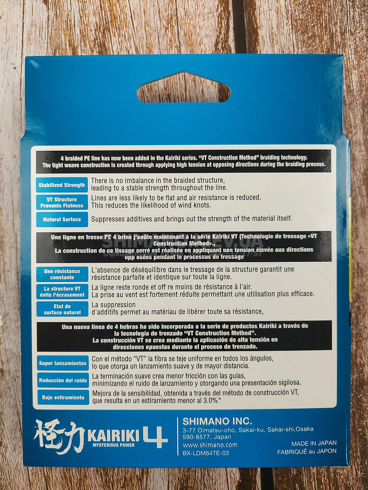 Японська плетінка розрахована на універсальну рибалку - Kairiki 4 PE має помірні показники жорсткості, затребувані варіанти діаметрів і стійке комбіноване забарвлення, яке покращує візуальне сприйняття процесу ведення приманки та клювання риби. Технологія Enhanced Body Technology створює досить щільний характер плетіння волокон шнура і зберігає свою структуру під впливом абразиву завдяки наявності покриття, що підвищує стійкість до пошкоджень.