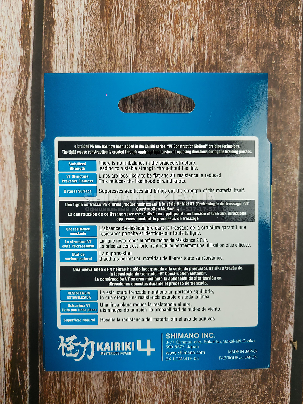 Японська плетінка розрахована на універсальну рибалку - Kairiki 4 PE має помірні показники жорсткості, затребувані варіанти діаметрів і стійке комбіноване забарвлення, яке покращує візуальне сприйняття процесу ведення приманки та клювання риби. Технологія Enhanced Body Technology створює досить щільний характер плетіння волокон шнура і зберігає свою структуру під впливом абразиву завдяки наявності покриття, що підвищує стійкість до пошкоджень.