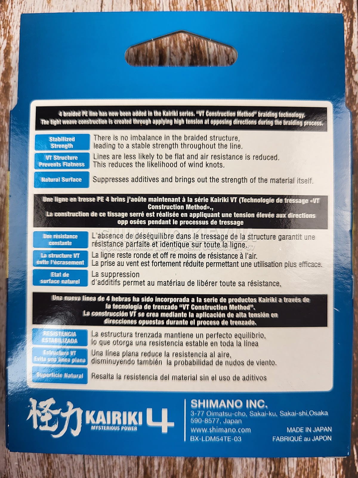 Японська плетінка розрахована на універсальну рибалку - Kairiki 4 PE має помірні показники жорсткості, затребувані варіанти діаметрів і стійке комбіноване забарвлення, яке покращує візуальне сприйняття процесу ведення приманки та клювання риби. Технологія Enhanced Body Technology створює досить щільний характер плетіння волокон шнура і зберігає свою структуру під впливом абразиву завдяки наявності покриття, що підвищує стійкість до пошкоджень.