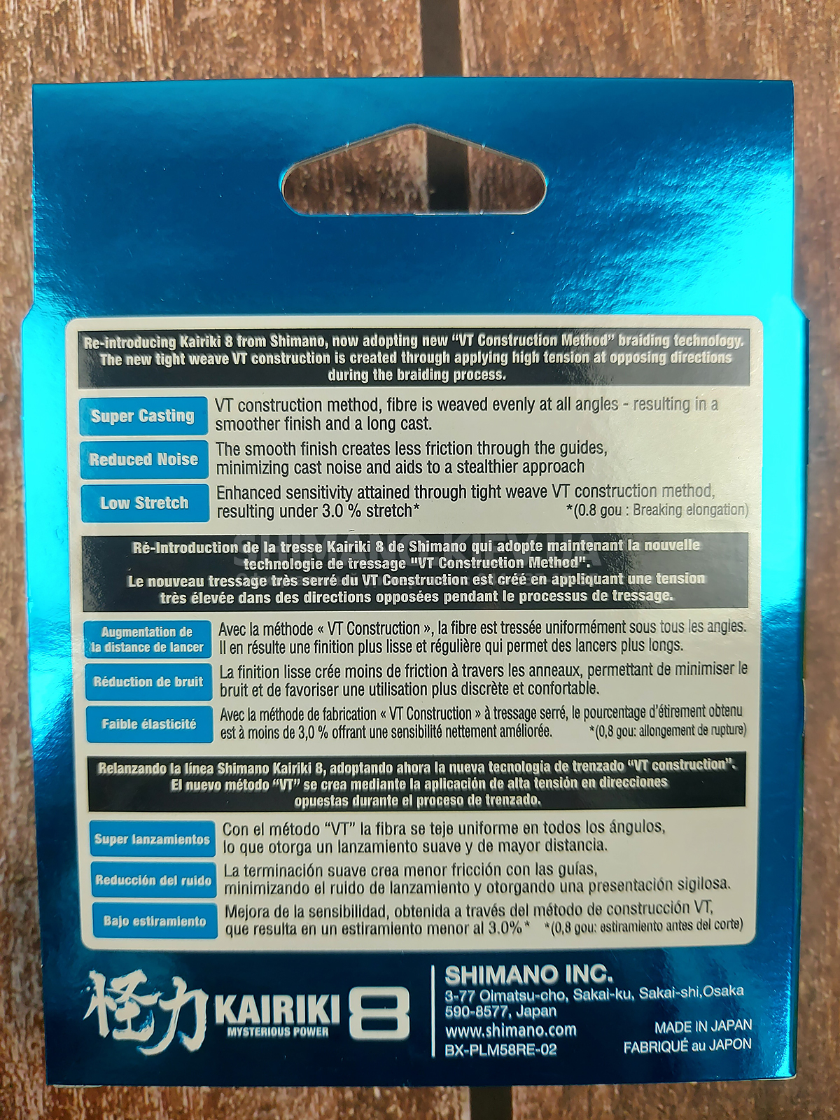 Нова конструкція VT із щільним переплетенням, що має 8 несучих елементів і чудове японське виробництво, створюється шляхом застосування високої напруги в протилежних напрямках під час процесу плетіння. У способі побудови VT волокно сплітається рівномірно під усіма кутами, що призводить до більш гладкої поверхні, зменшеного діаметру та збільшення дальності закидання. Крім того, гладка поверхня створює менше тертя через напрямні, зводить до мінімуму шум і забезпечує підвищену чутливість, що призводить до низького розтягування. Kairiki 8 - це, нарешті, дуже хороше обплетення для джиггінгу, тому що воно має низьку водостійкість та еластичність менше 3%.