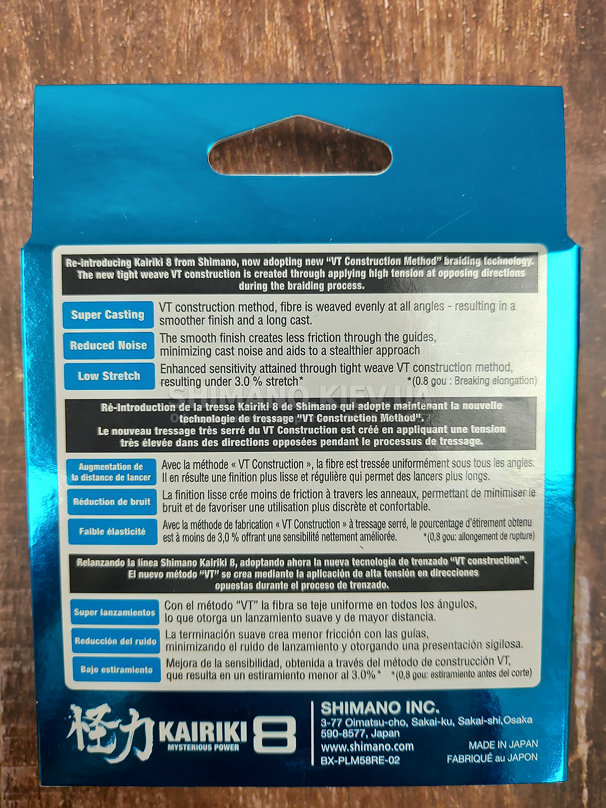 Нова конструкція VT із щільним переплетенням, що має 8 несучих елементів і чудове японське виробництво, створюється шляхом застосування високої напруги в протилежних напрямках під час процесу плетіння. У способі побудови VT волокно сплітається рівномірно під усіма кутами, що призводить до більш гладкої поверхні, зменшеного діаметру та збільшення дальності закидання. Крім того, гладка поверхня створює менше тертя через напрямні, зводить до мінімуму шум і забезпечує підвищену чутливість, що призводить до низького розтягування. Kairiki 8 - це, нарешті, дуже хороше обплетення для джиггінгу, тому що воно має низьку водостійкість та еластичність менше 3%.