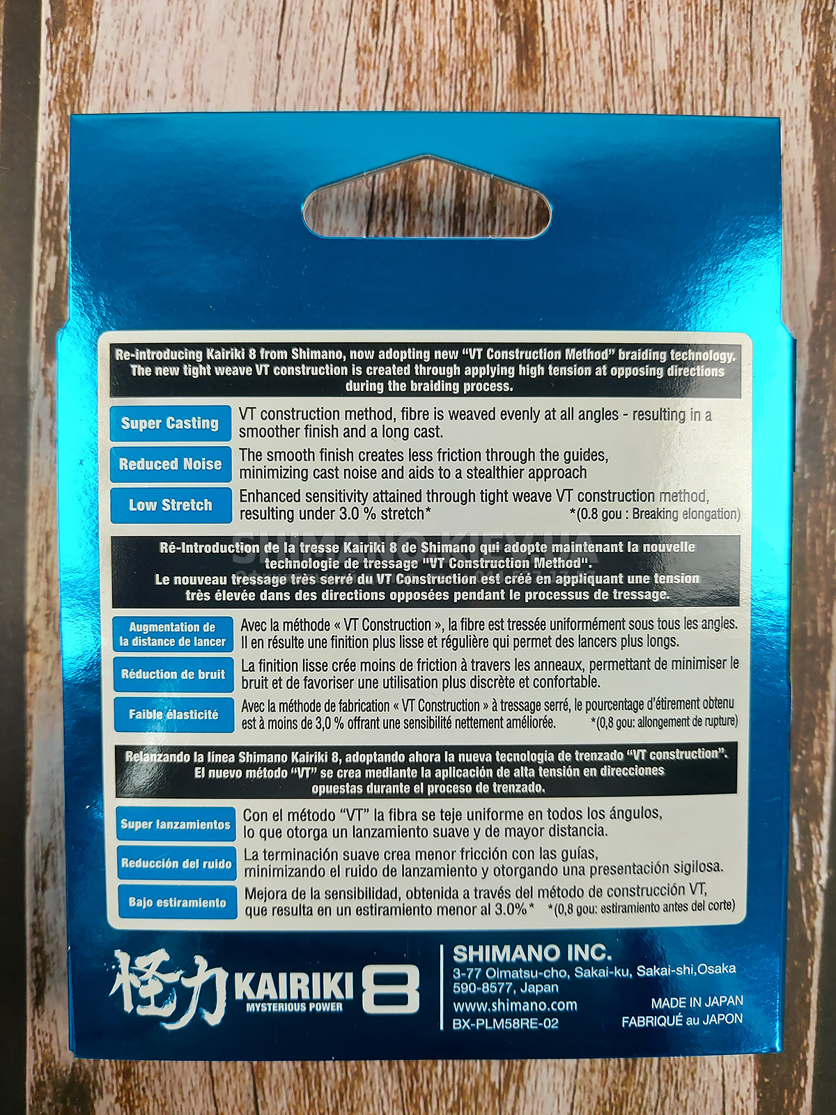 Нова конструкція VT із щільним переплетенням, що має 8 несучих елементів і чудове японське виробництво, створюється шляхом застосування високої напруги в протилежних напрямках під час процесу плетіння. У способі побудови VT волокно сплітається рівномірно під усіма кутами, що призводить до більш гладкої поверхні, зменшеного діаметру та збільшення дальності закидання. Крім того, гладка поверхня створює менше тертя через напрямні, зводить до мінімуму шум і забезпечує підвищену чутливість, що призводить до низького розтягування. Kairiki 8 - це, нарешті, дуже хороше обплетення для джиггінгу, тому що воно має низьку водостійкість та еластичність менше 3%.