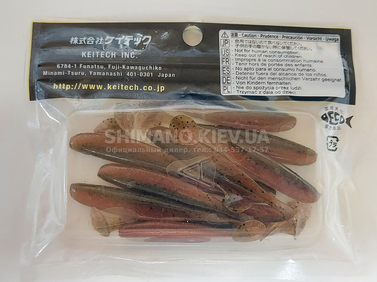 Силікон Keitech Easy Shiner – яскравий представник "їстівного" силікону, що став дуже популярним в останні роки. ІзіШайнер має класичну форму мінноу. Це форма кормової риби, якою переважно і харчується будь-який хижак. А матеріал з якого зроблена приманка схиляє на клювання навіть самого пасивного хижака. Принада оснащена прорізом для офсетного гачка. Може використовуватися для лову на класичний джиг, "дроп-шот", "техас", а також для інших способів лову.