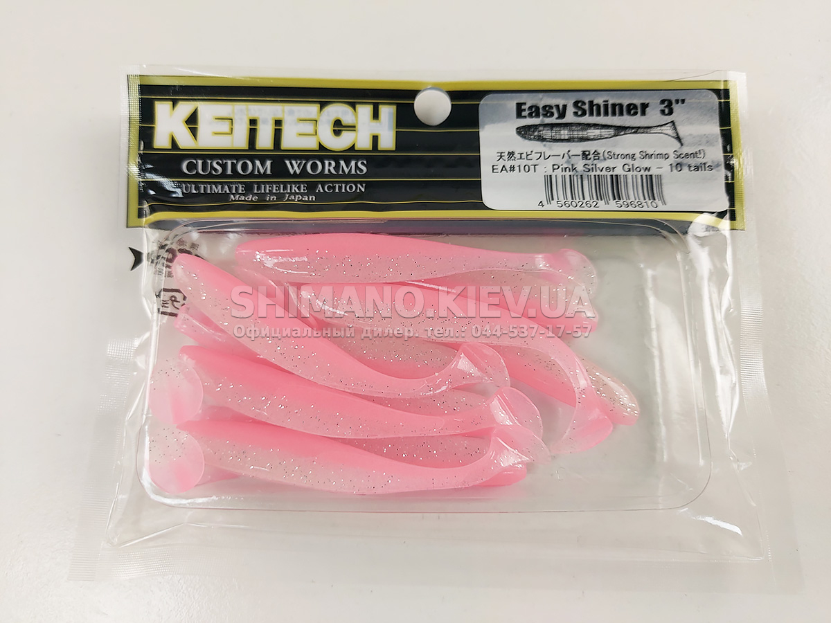 Силікон Keitech Easy Shiner – яскравий представник "їстівного" силікону, що став дуже популярним в останні роки. ІзіШайнер має класичну форму мінноу. Це форма кормової риби, якою переважно і харчується будь-який хижак. А матеріал з якого зроблена приманка схиляє на клювання навіть самого пасивного хижака. Принада оснащена прорізом для офсетного гачка. Може використовуватися для лову на класичний джиг, "дроп-шот", "техас", а також для інших способів лову.