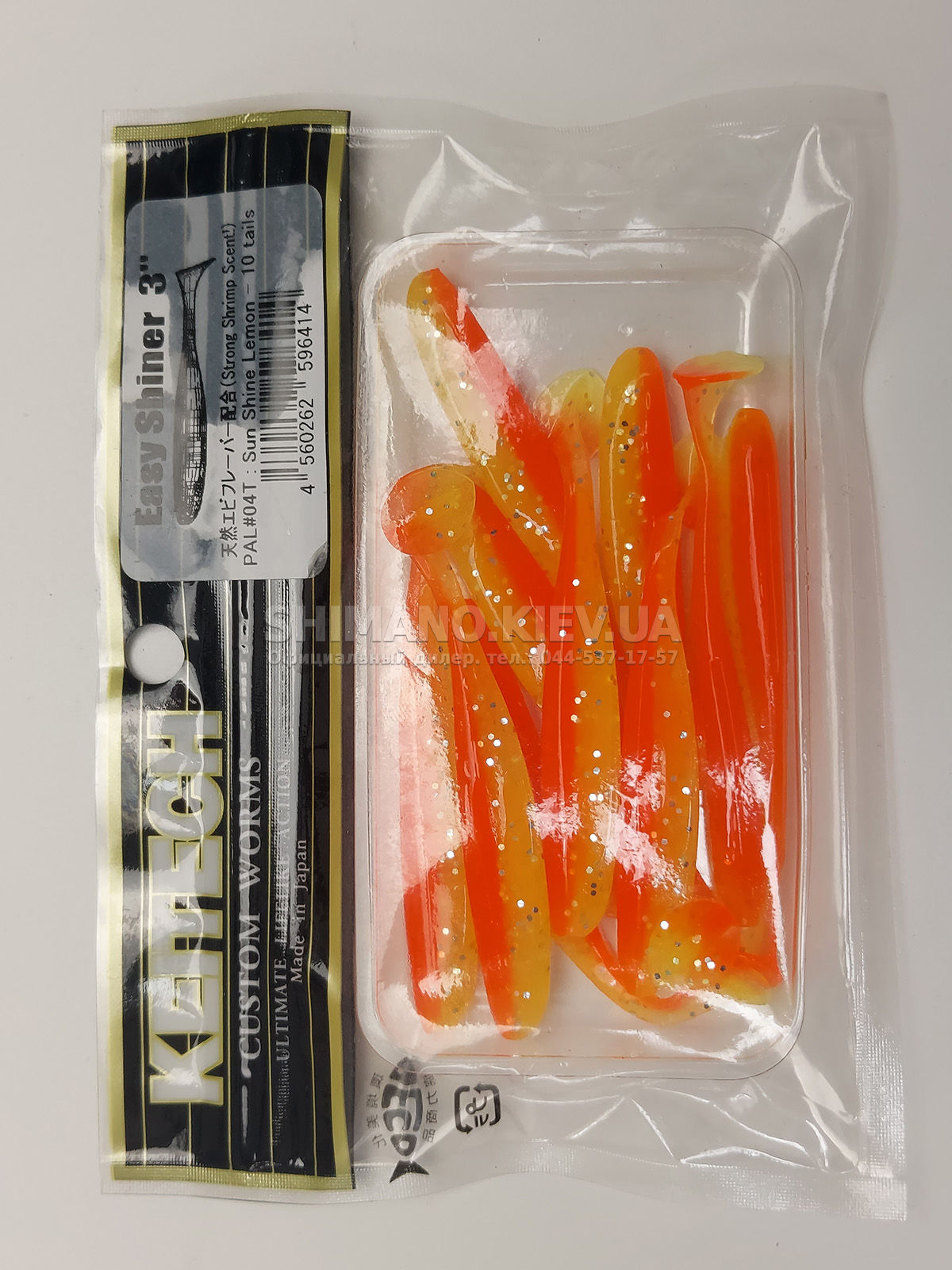 Силікон Keitech Easy Shiner – яскравий представник "їстівного" силікону, що став дуже популярним в останні роки. ІзіШайнер має класичну форму мінноу. Це форма кормової риби, якою переважно і харчується будь-який хижак. А матеріал з якого зроблена приманка схиляє на клювання навіть самого пасивного хижака. Принада оснащена прорізом для офсетного гачка. Може використовуватися для лову на класичний джиг, "дроп-шот", "техас", а також для інших способів лову.