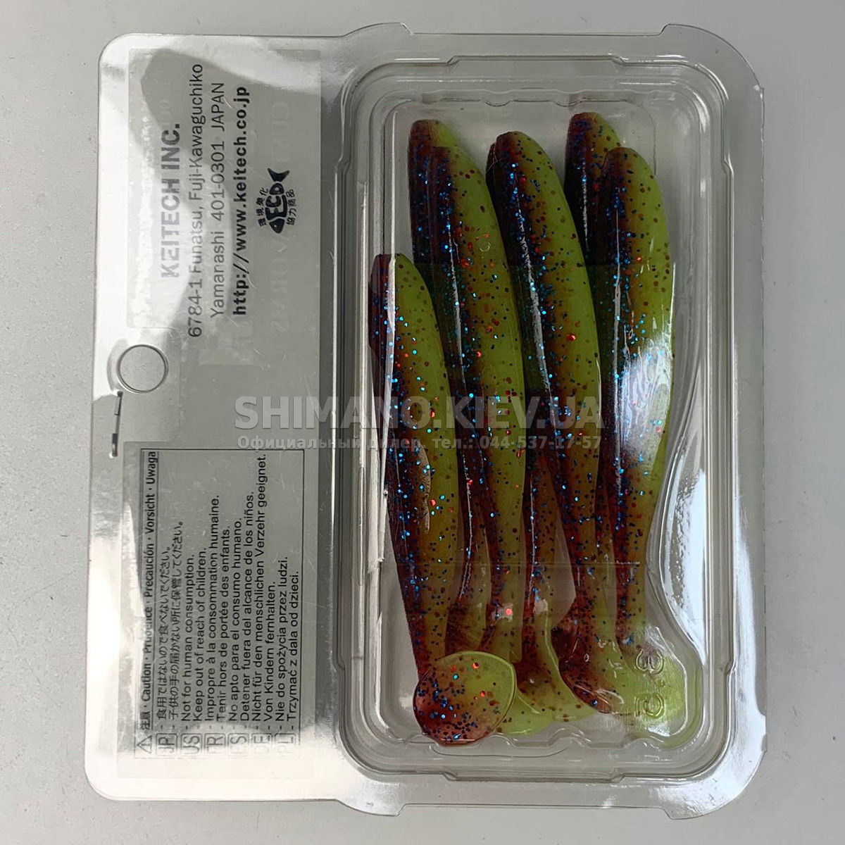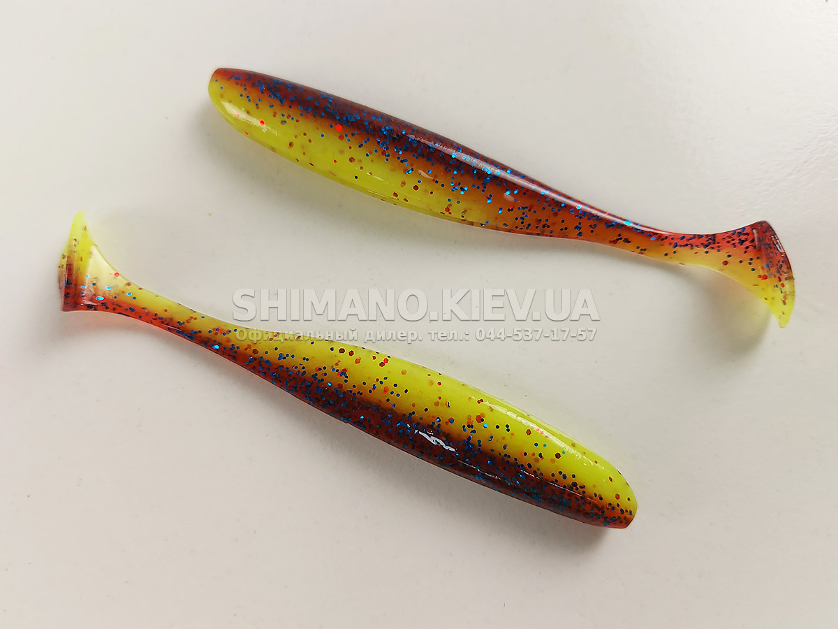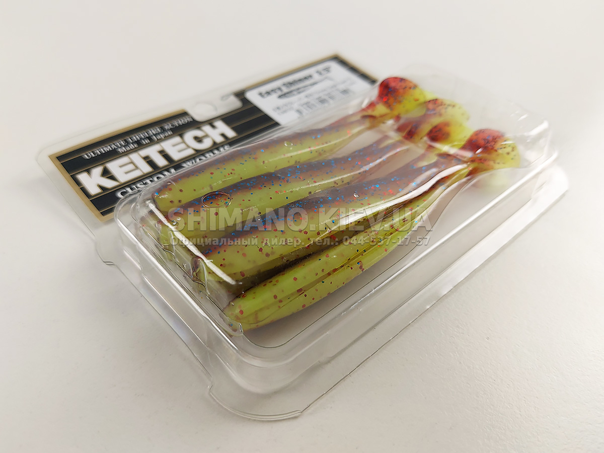 Силікон Keitech Easy Shiner – яскравий представник "їстівного" силікону, що став дуже популярним в останні роки. ІзіШайнер має класичну форму мінноу. Це форма кормової риби, якою переважно і харчується будь-який хижак. А матеріал з якого зроблена приманка схиляє на клювання навіть самого пасивного хижака. Принада оснащена прорізом для офсетного гачка. Може використовуватися для лову на класичний джиг, "дроп-шот", "техас", а також для інших способів лову.