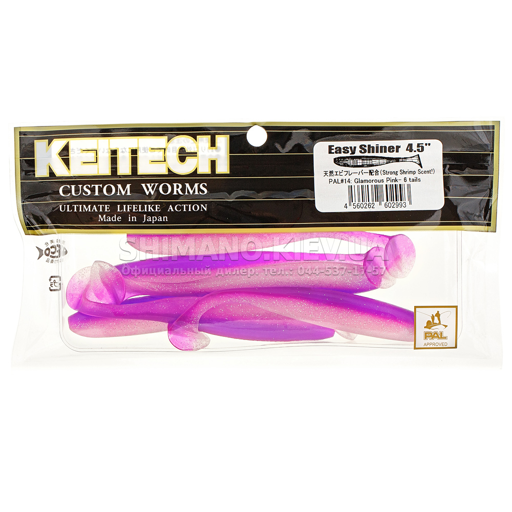 Силікон Keitech Easy Shiner – яскравий представник "їстівного" силікону, що став дуже популярним в останні роки. ІзіШайнер має класичну форму мінноу. Це форма кормової риби, якою переважно і харчується будь-який хижак. А матеріал з якого зроблена приманка схиляє на клювання навіть самого пасивного хижака. Принада оснащена прорізом для офсетного гачка. Може використовуватися для лову на класичний джиг, "дроп-шот", "техас", а також для інших способів лову.