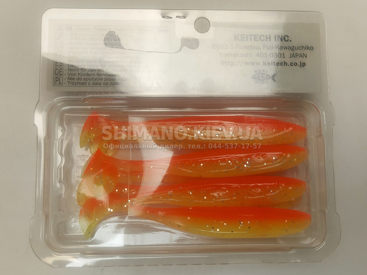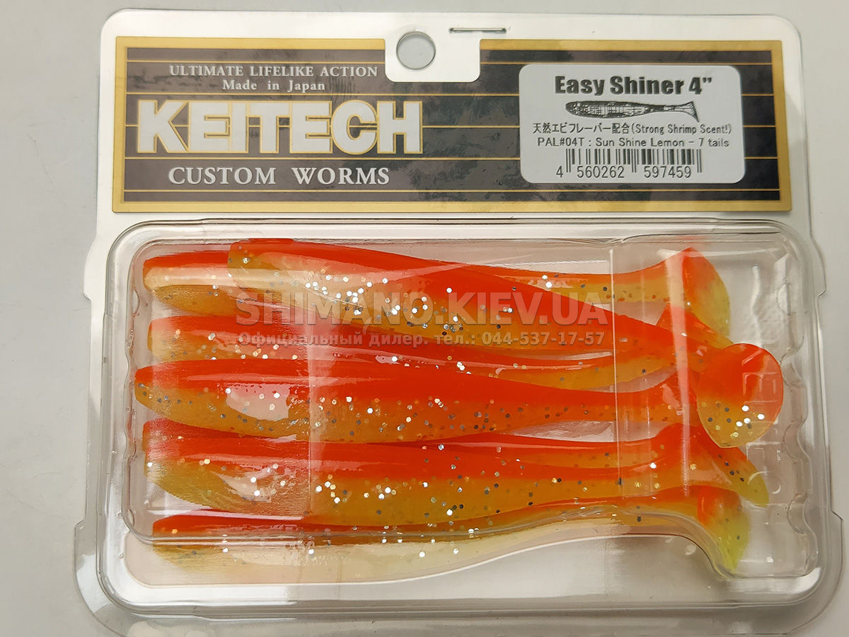 Силікон Keitech Easy Shiner – яскравий представник "їстівного" силікону, що став дуже популярним в останні роки. ІзіШайнер має класичну форму мінноу. Це форма кормової риби, якою переважно і харчується будь-який хижак. А матеріал з якого зроблена приманка схиляє на клювання навіть самого пасивного хижака. Принада оснащена прорізом для офсетного гачка. Може використовуватися для лову на класичний джиг, "дроп-шот", "техас", а також для інших способів лову.