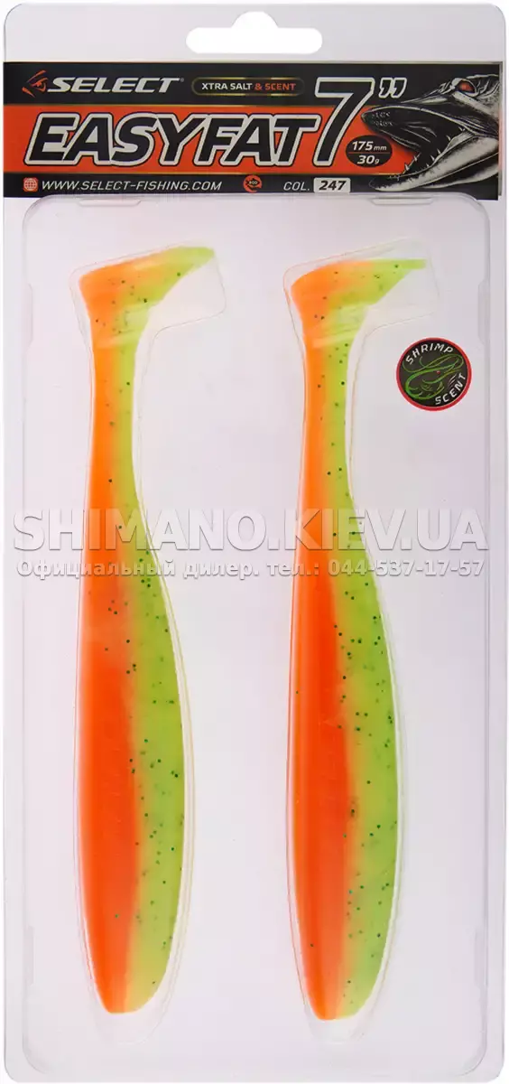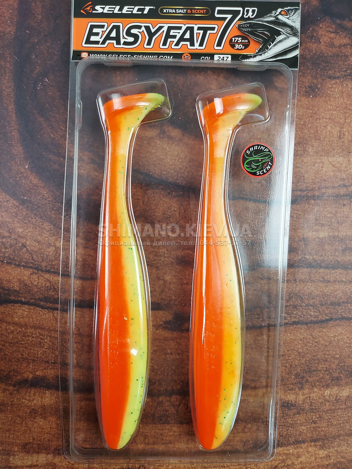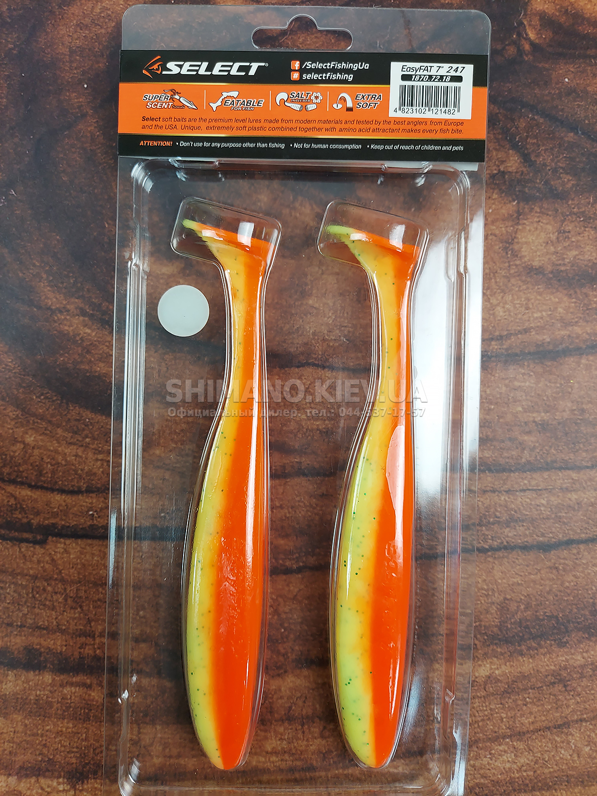 Силікон Select Easy Fat на перший погляд нагадує Easy Shad, але відрізняється від нього більш високим та товстим тілом, а також більшою хвостовою п'яткою. Це дозволило візуально збільшити приманку та зробити її гру дуже активною та розмашистою. Завдяки таким трансформаціям Easy Fat є більш привабливим для крупної щуки та судака, які можуть з великої відстані вловити усі вібрації та із задоволенням атакують м'ясисту здобич.