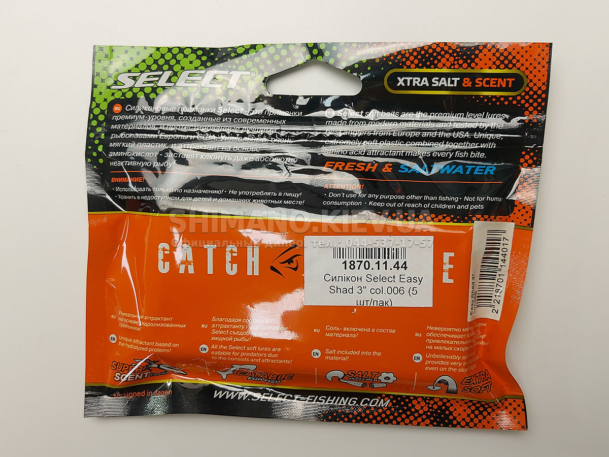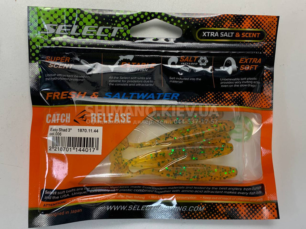 Популярна форма віброхвісту SELECT Easy Shad для лову судака, щуки та великого окуня. Принади володіють усім, щоб привернути увагу хижої риби - форма малька, еластичний їстівний матеріал і активний хвіст, що створює неймовірні коливання у воді.