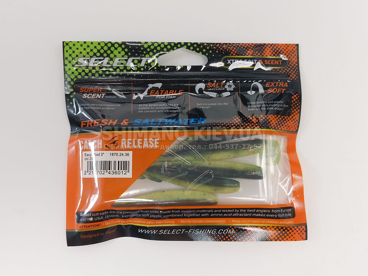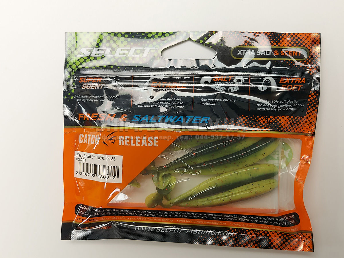 Популярна форма віброхвісту SELECT Easy Shad для лову судака, щуки та великого окуня. Принади володіють усім, щоб привернути увагу хижої риби - форма малька, еластичний їстівний матеріал і активний хвіст, що створює неймовірні коливання у воді.