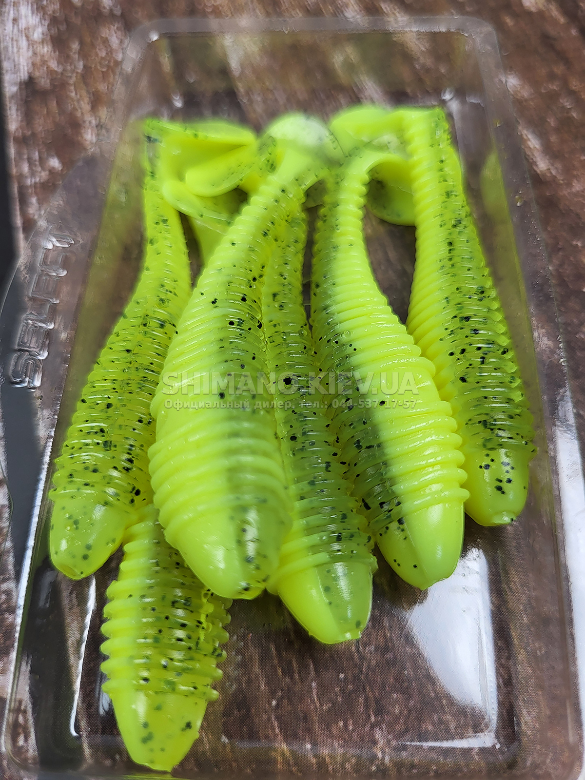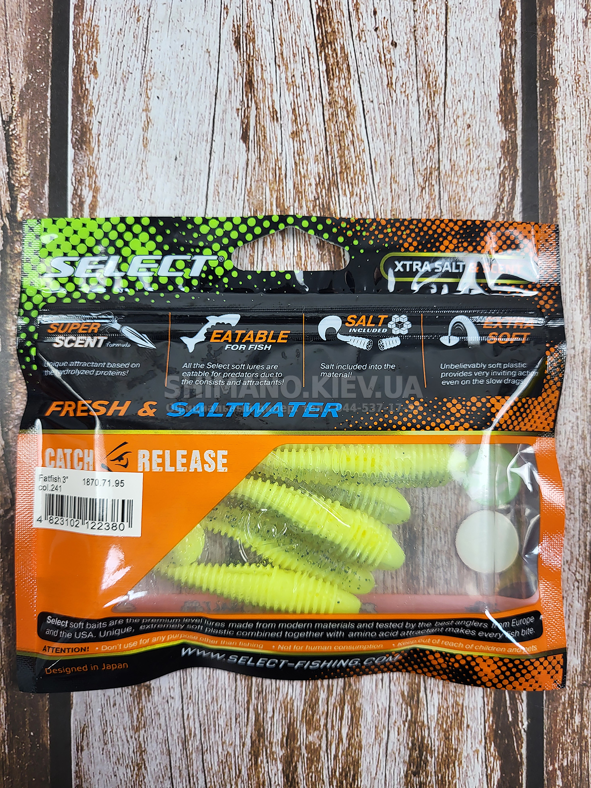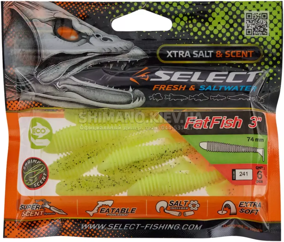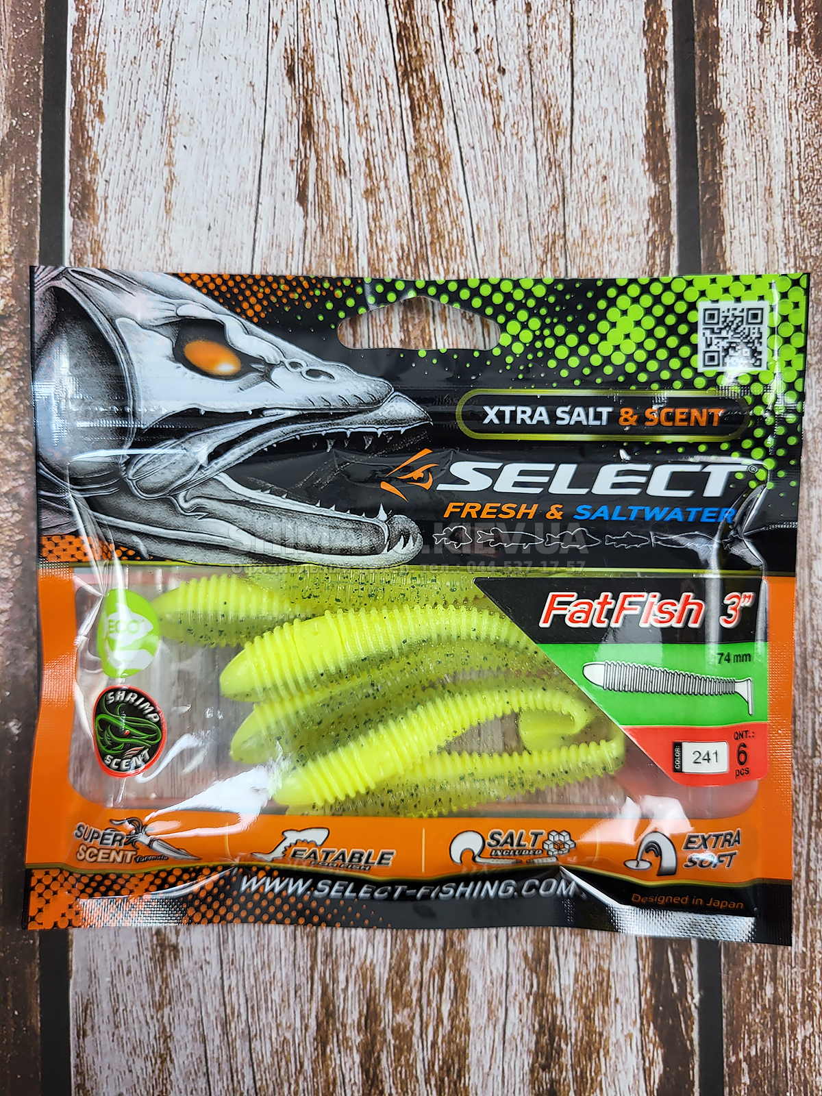 Силікон Select FatFish - віброхвіст з об'ємним тілом, покритим м'якими ребрами, як і у моделі FatFish. У приманки FatFish в нижній частині є спеціальне місце для додаткового підвантаження, якщо передбачається використовувати її в якості свімбейта. Під час проводки, за рахунок еластичності матеріалу, хвіст дуже розмашисто виляє по сторонам, вібрація від якого з великої відстані приваблює рибу. Ребра на тілі виконують кілька функцій. По-перше, вони створюють додаткову вібрацію, що приваблює рибу. По-друге, рифлене тіло на багато м'якше цільного, що позитивно позначається на грі приманки. По-третє, при клюванні риби, ребра легко зминаються і починають активно виділяти смакові добавки, що містяться в складі силікону, так що риба не помічає підступності і продовжує його заковтувати. Спокусливі виляння всім тілом і каламуть, що піднімається з дна джиг-головкою, активно привертають увагу риби, яка сміливо кидається на силікон.