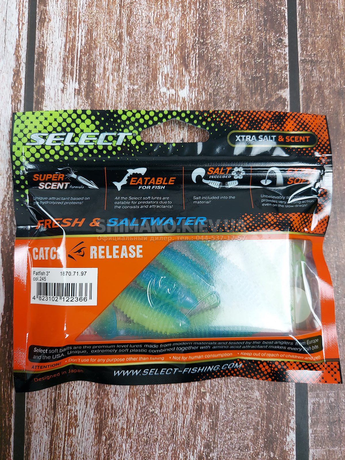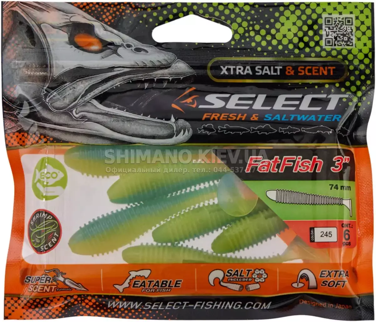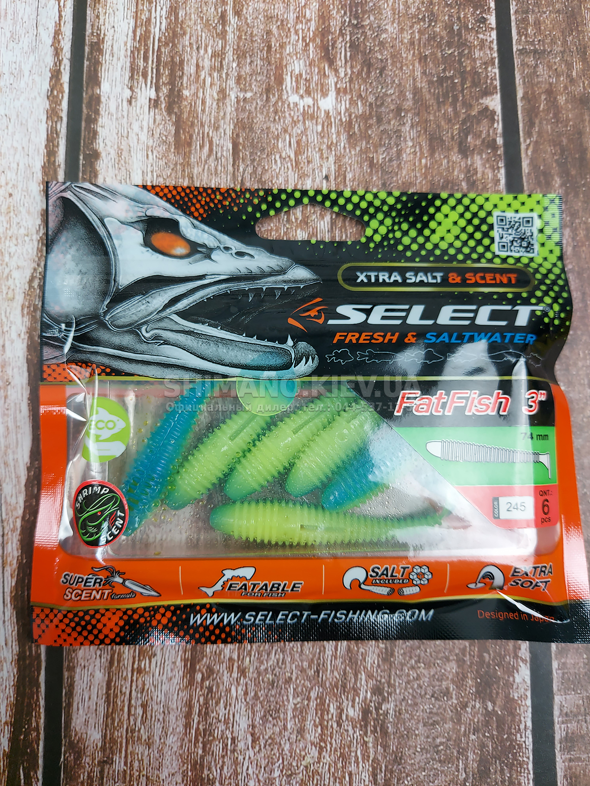 Силікон Select FatFish - віброхвіст з об'ємним тілом, покритим м'якими ребрами, як і у моделі FatFish. У приманки FatFish в нижній частині є спеціальне місце для додаткового підвантаження, якщо передбачається використовувати її в якості свімбейта. Під час проводки, за рахунок еластичності матеріалу, хвіст дуже розмашисто виляє по сторонам, вібрація від якого з великої відстані приваблює рибу. Ребра на тілі виконують кілька функцій. По-перше, вони створюють додаткову вібрацію, що приваблює рибу. По-друге, рифлене тіло на багато м'якше цільного, що позитивно позначається на грі приманки. По-третє, при клюванні риби, ребра легко зминаються і починають активно виділяти смакові добавки, що містяться в складі силікону, так що риба не помічає підступності і продовжує його заковтувати. Спокусливі виляння всім тілом і каламуть, що піднімається з дна джиг-головкою, активно привертають увагу риби, яка сміливо кидається на силікон.