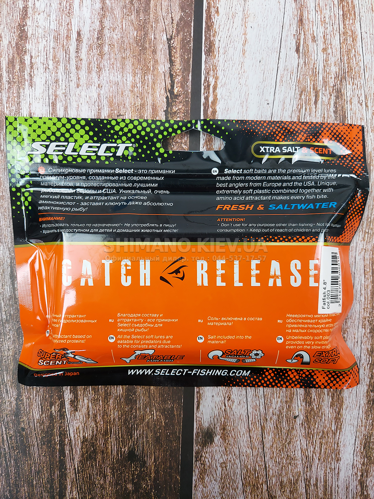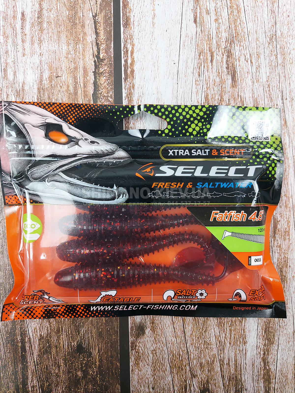 Силікон Select FatFish - віброхвіст з об'ємним тілом, покритим м'якими ребрами, як і у моделі FatFish. У приманки FatFish в нижній частині є спеціальне місце для додаткового підвантаження, якщо передбачається використовувати її в якості свімбейта. Під час проводки, за рахунок еластичності матеріалу, хвіст дуже розмашисто виляє по сторонам, вібрація від якого з великої відстані приваблює рибу. Ребра на тілі виконують кілька функцій. По-перше, вони створюють додаткову вібрацію, що приваблює рибу. По-друге, рифлене тіло на багато м'якше цільного, що позитивно позначається на грі приманки. По-третє, при клюванні риби, ребра легко зминаються і починають активно виділяти смакові добавки, що містяться в складі силікону, так що риба не помічає підступності і продовжує його заковтувати. Спокусливі виляння всім тілом і каламуть, що піднімається з дна джиг-головкою, активно привертають увагу риби, яка сміливо кидається на силікон.
