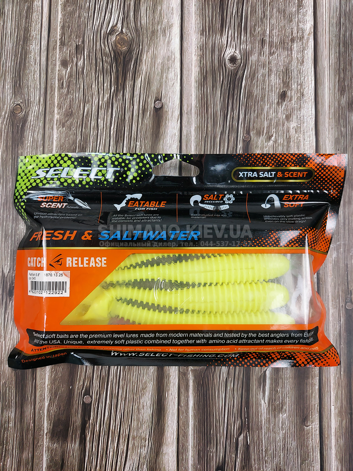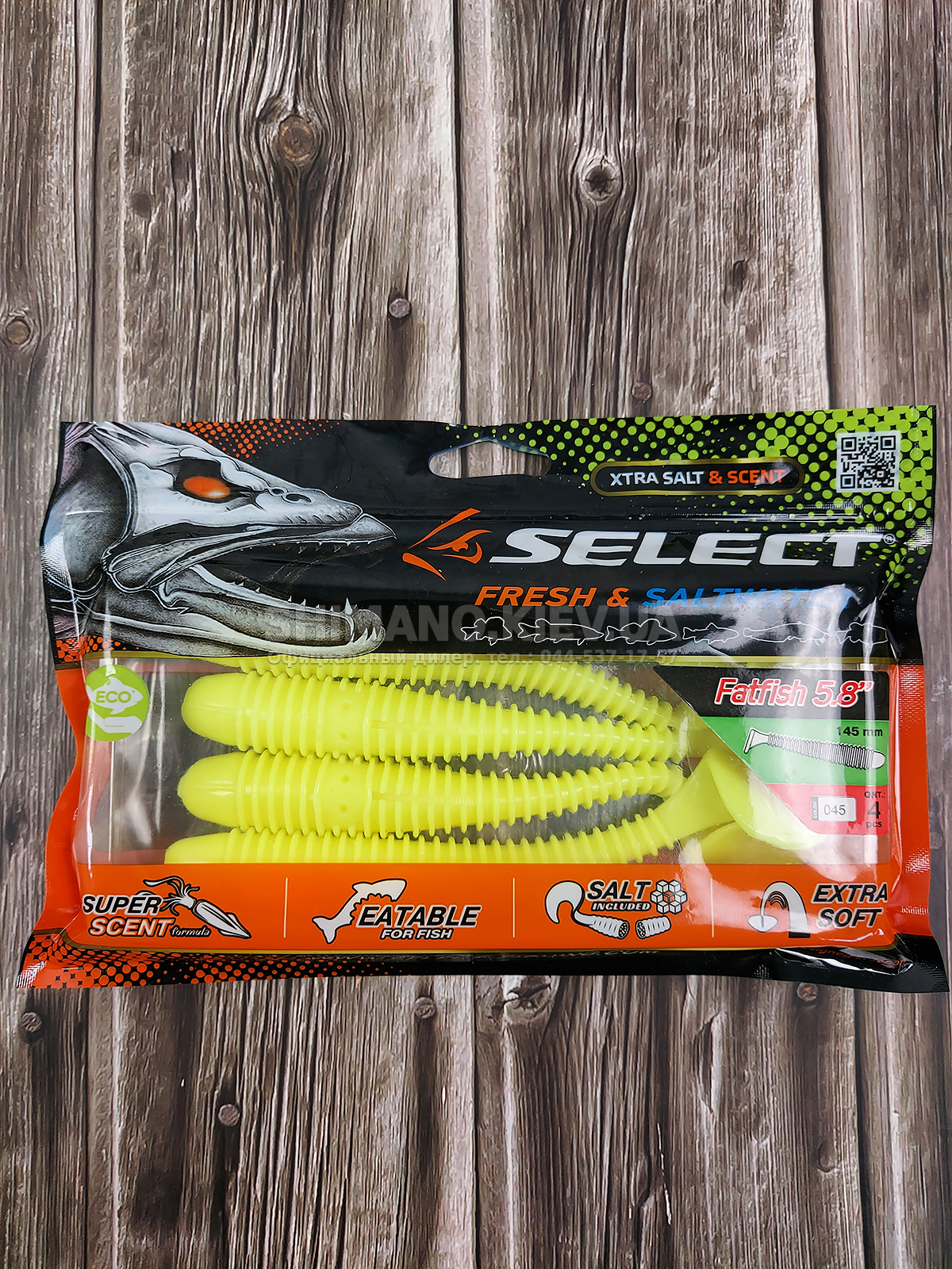 Силікон Select FatFish - віброхвіст з об'ємним тілом, покритим м'якими ребрами, як і у моделі FatFish. У приманки FatFish в нижній частині є спеціальне місце для додаткового підвантаження, якщо передбачається використовувати її в якості свімбейта. Під час проводки, за рахунок еластичності матеріалу, хвіст дуже розмашисто виляє по сторонам, вібрація від якого з великої відстані приваблює рибу. Ребра на тілі виконують кілька функцій. По-перше, вони створюють додаткову вібрацію, що приваблює рибу. По-друге, рифлене тіло на багато м'якше цільного, що позитивно позначається на грі приманки. По-третє, при клюванні риби, ребра легко зминаються і починають активно виділяти смакові добавки, що містяться в складі силікону, так що риба не помічає підступності і продовжує його заковтувати. Спокусливі виляння всім тілом і каламуть, що піднімається з дна джиг-головкою, активно привертають увагу риби, яка сміливо кидається на силікон.