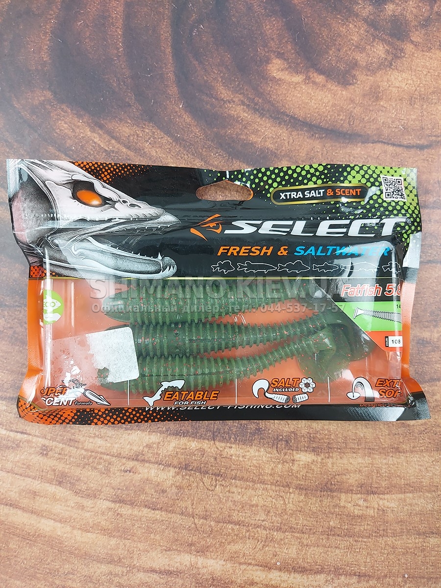 Силікон Select FatFish - віброхвіст з об'ємним тілом, покритим м'якими ребрами, як і у моделі FatFish. У приманки FatFish в нижній частині є спеціальне місце для додаткового підвантаження, якщо передбачається використовувати її в якості свімбейта. Під час проводки, за рахунок еластичності матеріалу, хвіст дуже розмашисто виляє по сторонам, вібрація від якого з великої відстані приваблює рибу. Ребра на тілі виконують кілька функцій. По-перше, вони створюють додаткову вібрацію, що приваблює рибу. По-друге, рифлене тіло на багато м'якше цільного, що позитивно позначається на грі приманки. По-третє, при клюванні риби, ребра легко зминаються і починають активно виділяти смакові добавки, що містяться в складі силікону, так що риба не помічає підступності і продовжує його заковтувати. Спокусливі виляння всім тілом і каламуть, що піднімається з дна джиг-головкою, активно привертають увагу риби, яка сміливо кидається на силікон.
