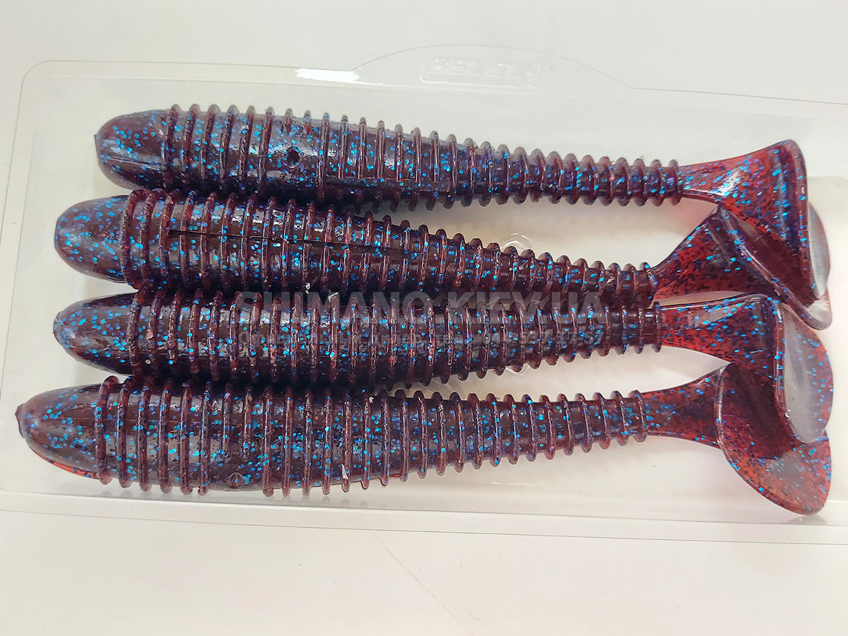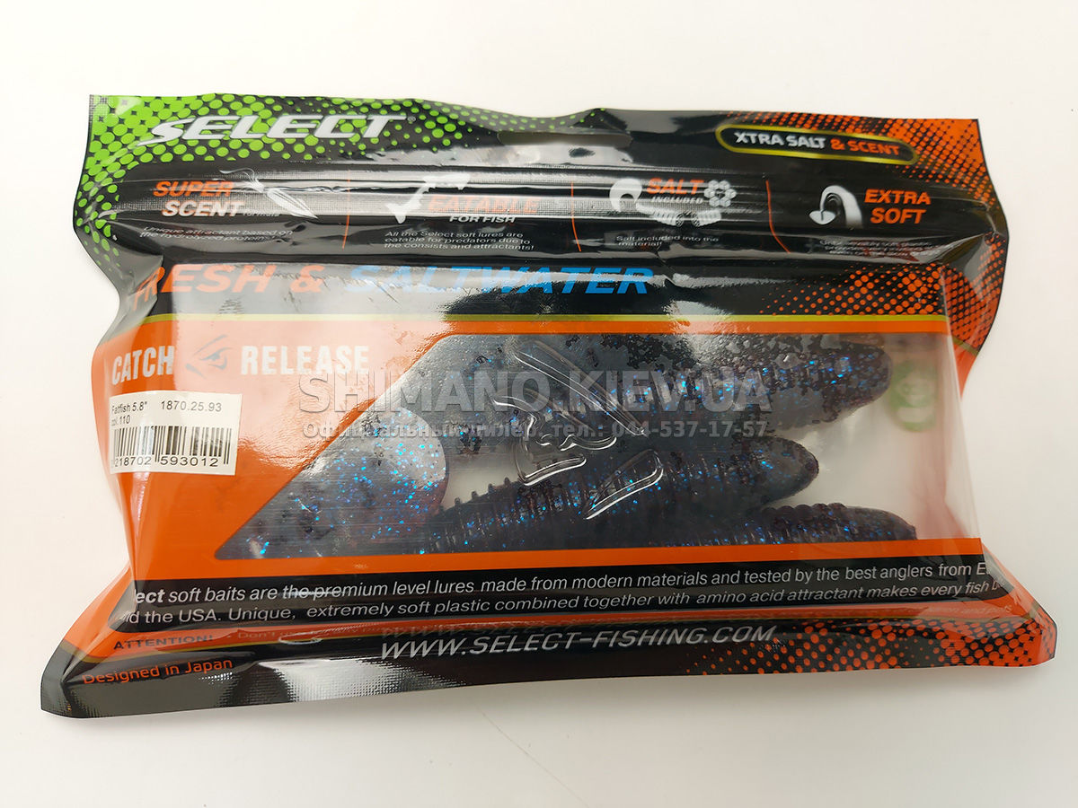 Силікон Select FatFish - віброхвіст з об'ємним тілом, покритим м'якими ребрами, як і у моделі FatFish. У приманки FatFish в нижній частині є спеціальне місце для додаткового підвантаження, якщо передбачається використовувати її в якості свімбейта. Під час проводки, за рахунок еластичності матеріалу, хвіст дуже розмашисто виляє по сторонам, вібрація від якого з великої відстані приваблює рибу. Ребра на тілі виконують кілька функцій. По-перше, вони створюють додаткову вібрацію, що приваблює рибу. По-друге, рифлене тіло на багато м'якше цільного, що позитивно позначається на грі приманки. По-третє, при клюванні риби, ребра легко зминаються і починають активно виділяти смакові добавки, що містяться в складі силікону, так що риба не помічає підступності і продовжує його заковтувати. Спокусливі виляння всім тілом і каламуть, що піднімається з дна джиг-головкою, активно привертають увагу риби, яка сміливо кидається на силікон.