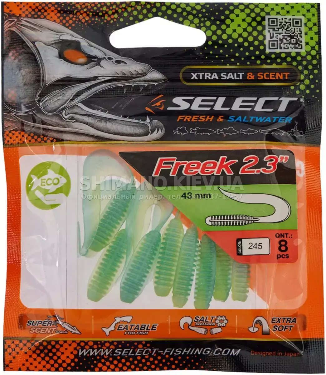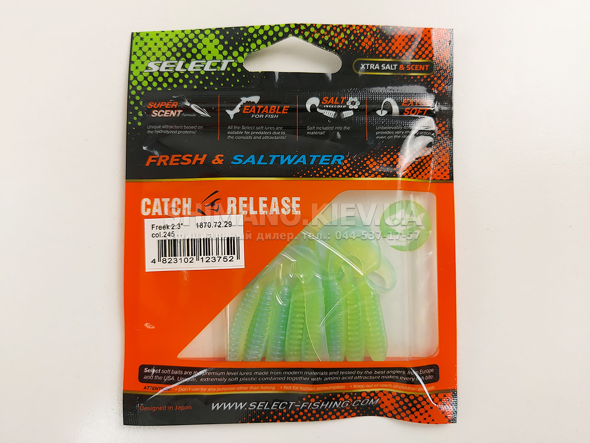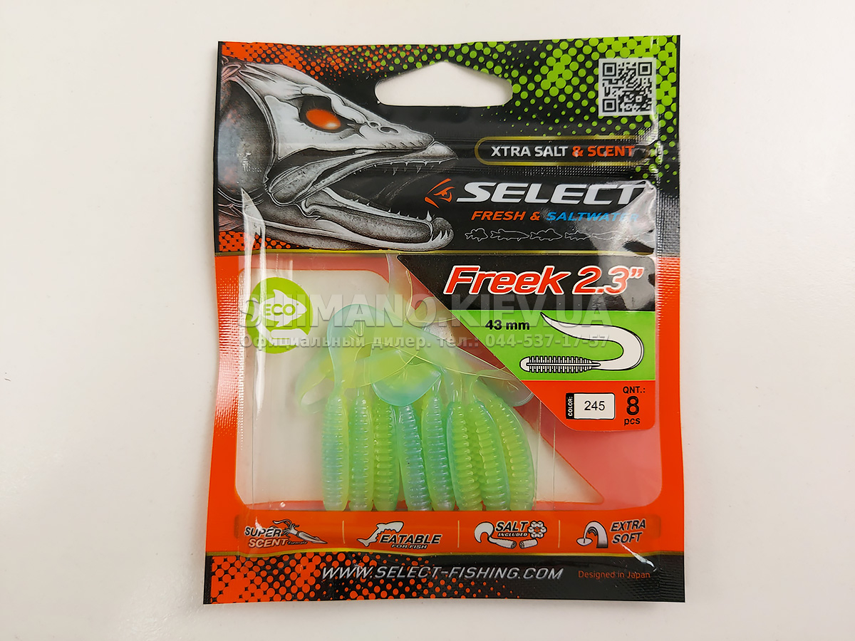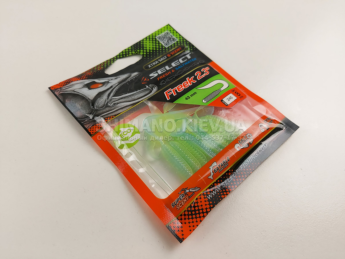 Найновіша приманка SELECT Freek. Її м'ясисте тіло та широкий хвіст ідеально підходять для лову судака, активного окуня та вічно голодної щуки. Незвичайна форма хвоста і спеціально підібраний силікон моментально включають приманку в гру як на будь-якій швидкості проводки, так і на підкиданні або в падінні. Все це дозволяє робити різну анімацію і успішно залучати хижака по будь-якій воді. Також варто відзначити, що більш щільне та широке тіло ідеально підходить для різних типів оснастки, включаючи класичний джиг та подвійні гачки. Для досягнення максимального ефекту рекомендуємо використовувати шарнірний монтаж: дроп-шот, кароліна, відвідний повідець або вантаж «чебурашка». Як завжди, представлена величезна гама кольорів і в майбутньому розмірів.