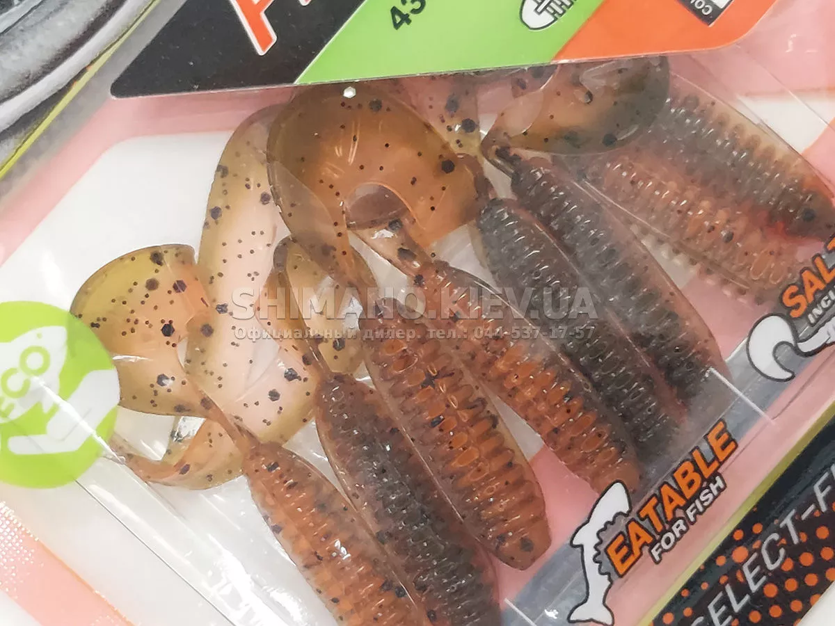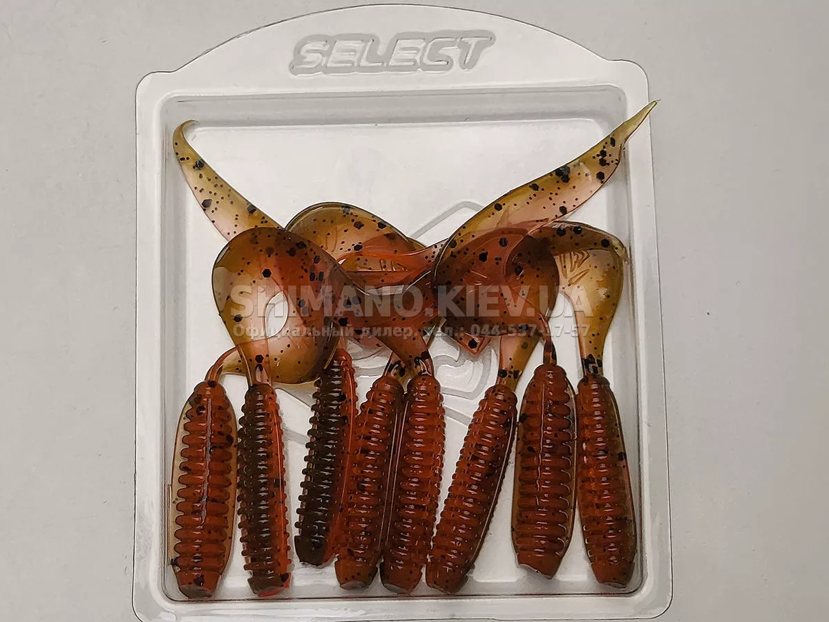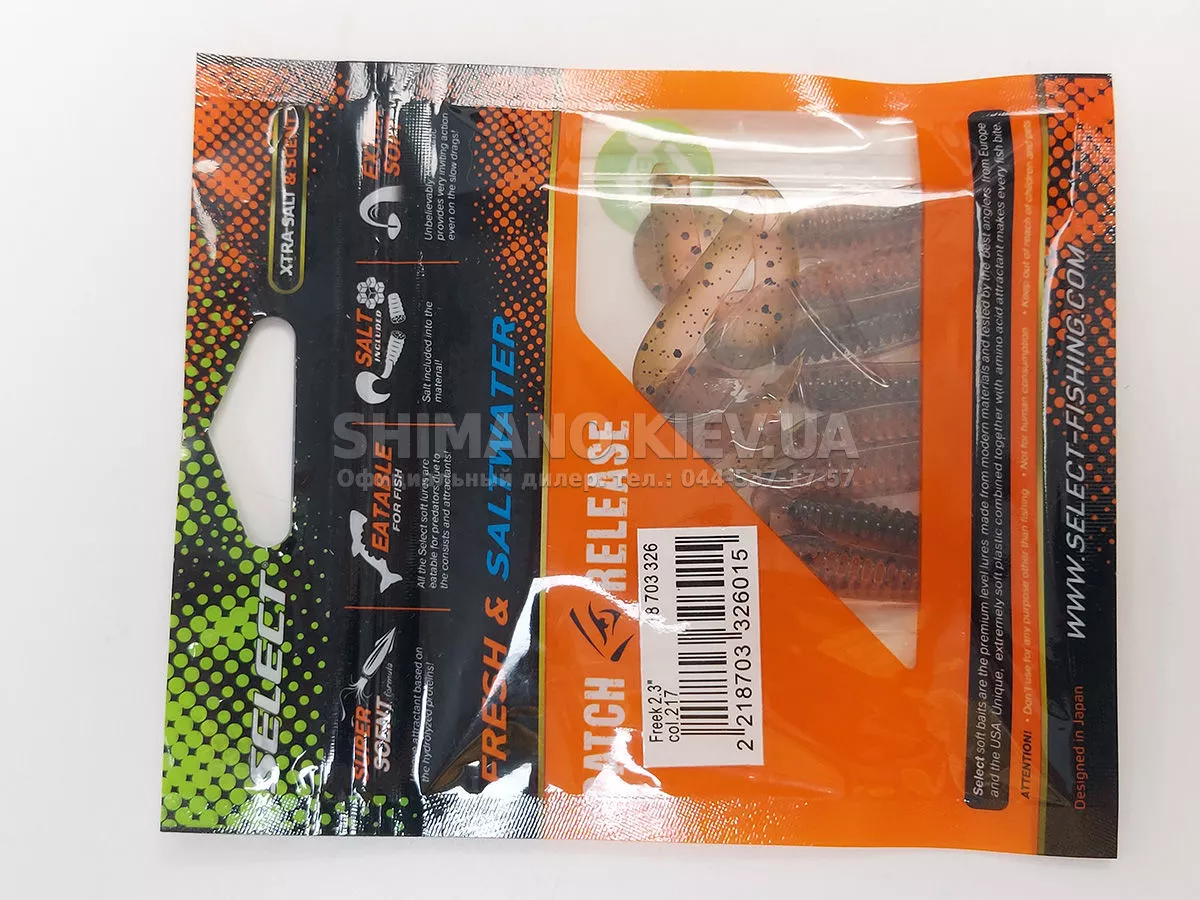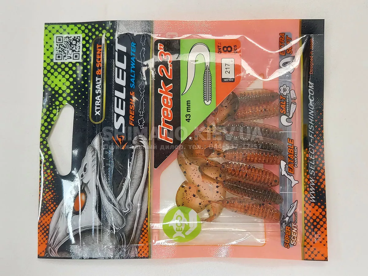 Найновіша приманка SELECT Freek. Її м'ясисте тіло та широкий хвіст ідеально підходять для лову судака, активного окуня та вічно голодної щуки. Незвичайна форма хвоста і спеціально підібраний силікон моментально включають приманку в гру як на будь-якій швидкості проводки, так і на підкиданні або в падінні. Все це дозволяє робити різну анімацію і успішно залучати хижака по будь-якій воді. Також варто відзначити, що більш щільне та широке тіло ідеально підходить для різних типів оснастки, включаючи класичний джиг та подвійні гачки. Для досягнення максимального ефекту рекомендуємо використовувати шарнірний монтаж: дроп-шот, кароліна, відвідний повідець або вантаж «чебурашка». Як завжди, представлена величезна гама кольорів і в майбутньому розмірів.