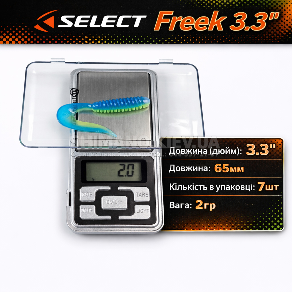 Найновіша приманка SELECT Freek. Її м'ясисте тіло та широкий хвіст ідеально підходять для лову судака, активного окуня та вічно голодної щуки. Незвичайна форма хвоста і спеціально підібраний силікон моментально включають приманку в гру як на будь-якій швидкості проводки, так і на підкиданні або в падінні. Все це дозволяє робити різну анімацію і успішно залучати хижака по будь-якій воді. Також варто відзначити, що більш щільне та широке тіло ідеально підходить для різних типів оснастки, включаючи класичний джиг та подвійні гачки. Для досягнення максимального ефекту рекомендуємо використовувати шарнірний монтаж: дроп-шот, кароліна, відвідний повідець або вантаж «чебурашка». Як завжди, представлена величезна гама кольорів і в майбутньому розмірів.