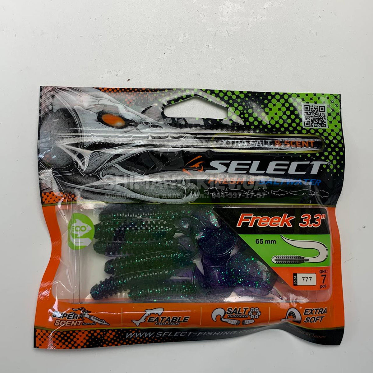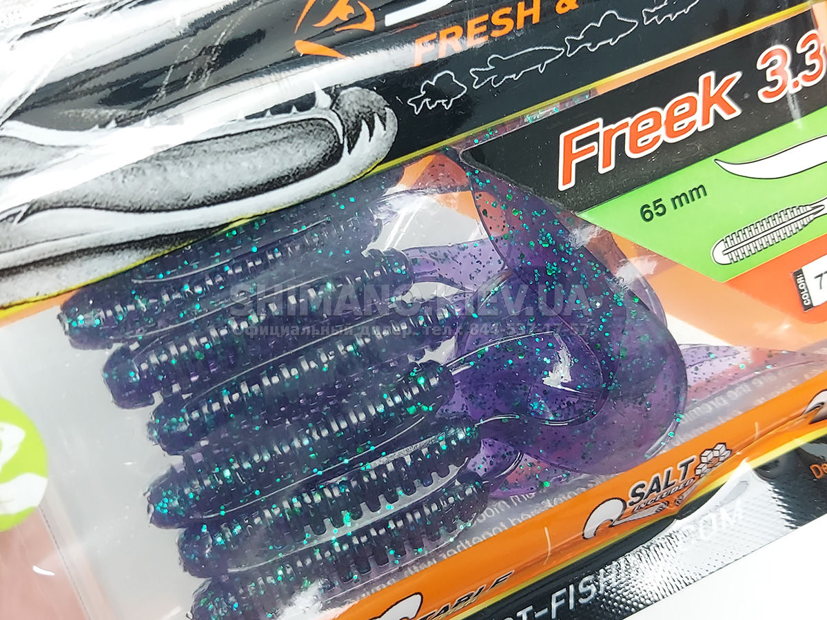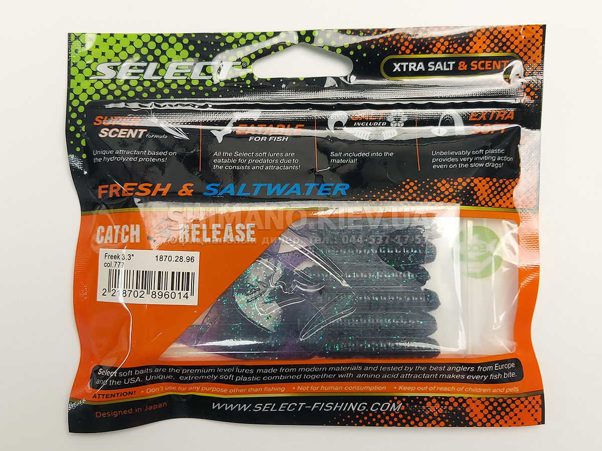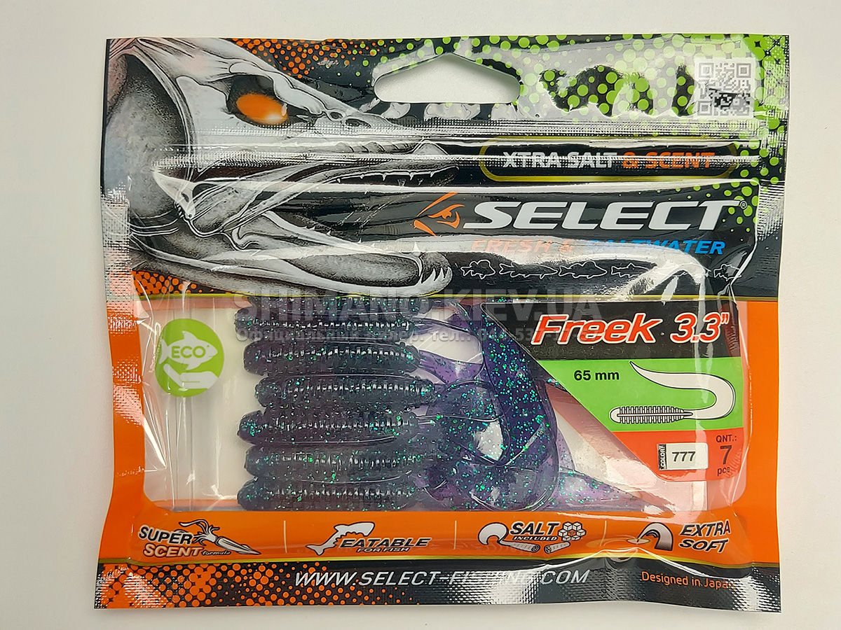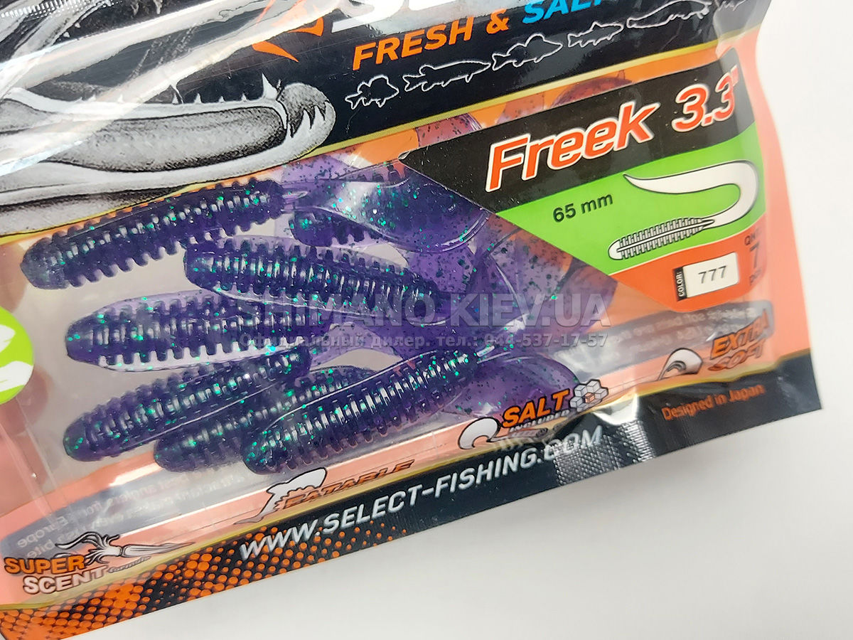 Найновіша приманка SELECT Freek. Її м'ясисте тіло та широкий хвіст ідеально підходять для лову судака, активного окуня та вічно голодної щуки. Незвичайна форма хвоста і спеціально підібраний силікон моментально включають приманку в гру як на будь-якій швидкості проводки, так і на підкиданні або в падінні. Все це дозволяє робити різну анімацію і успішно залучати хижака по будь-якій воді. Також варто відзначити, що більш щільне та широке тіло ідеально підходить для різних типів оснастки, включаючи класичний джиг та подвійні гачки. Для досягнення максимального ефекту рекомендуємо використовувати шарнірний монтаж: дроп-шот, кароліна, відвідний повідець або вантаж «чебурашка». Як завжди, представлена величезна гама кольорів і в майбутньому розмірів.