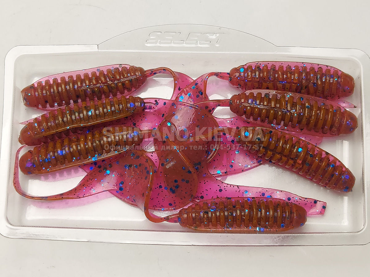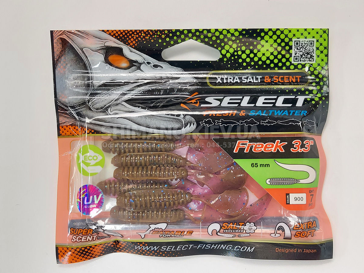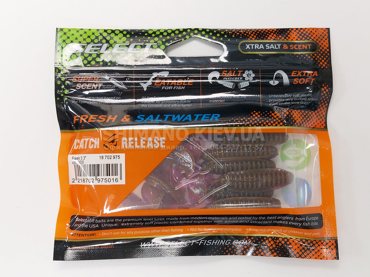 Найновіша приманка SELECT Freek. Її м'ясисте тіло та широкий хвіст ідеально підходять для лову судака, активного окуня та вічно голодної щуки. Незвичайна форма хвоста і спеціально підібраний силікон моментально включають приманку в гру як на будь-якій швидкості проводки, так і на підкиданні або в падінні. Все це дозволяє робити різну анімацію і успішно залучати хижака по будь-якій воді. Також варто відзначити, що більш щільне та широке тіло ідеально підходить для різних типів оснастки, включаючи класичний джиг та подвійні гачки. Для досягнення максимального ефекту рекомендуємо використовувати шарнірний монтаж: дроп-шот, кароліна, відвідний повідець або вантаж «чебурашка». Як завжди, представлена величезна гама кольорів і в майбутньому розмірів.