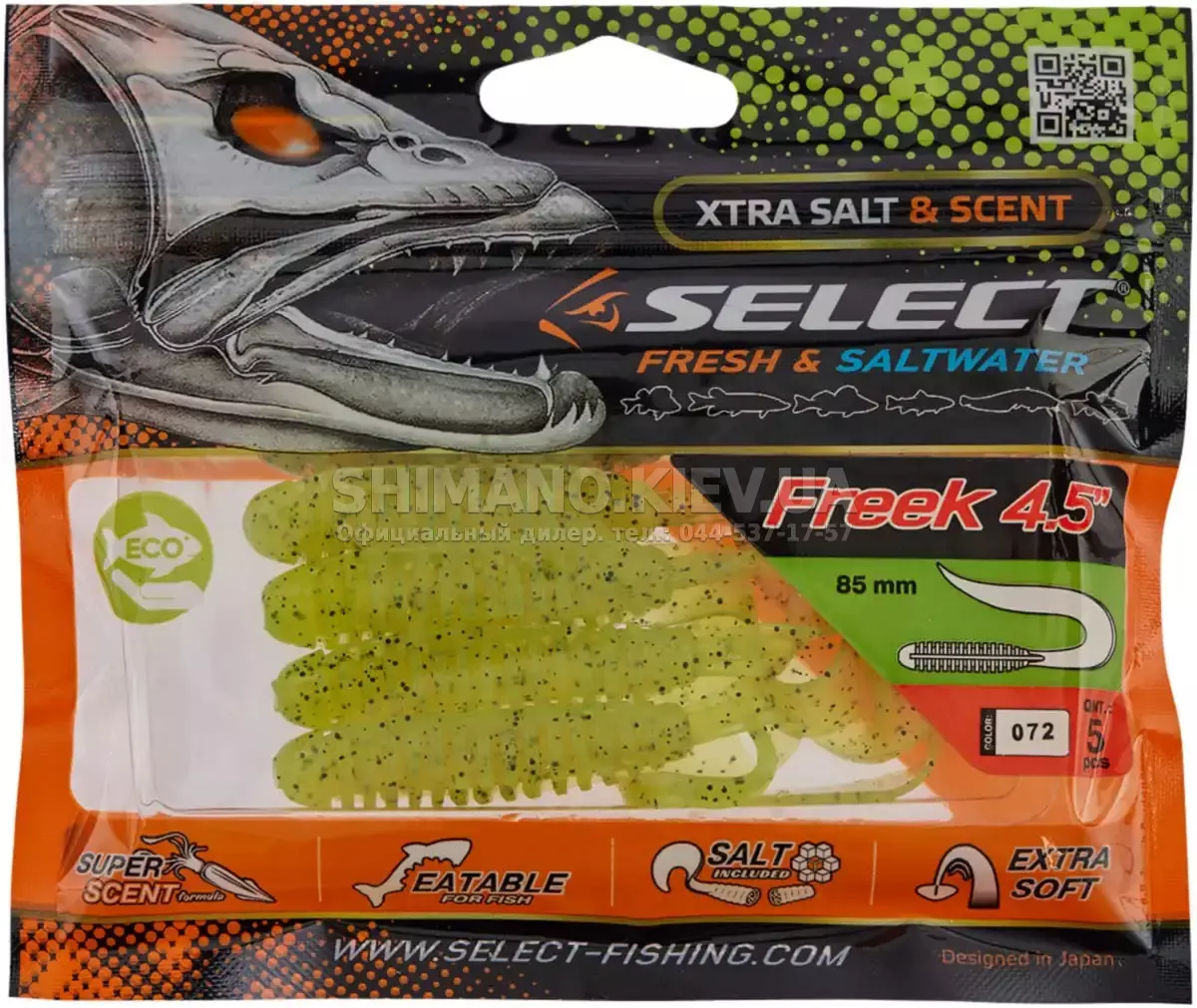 Найновіша приманка SELECT Freek. Її м'ясисте тіло та широкий хвіст ідеально підходять для лову судака, активного окуня та вічно голодної щуки. Незвичайна форма хвоста і спеціально підібраний силікон моментально включають приманку в гру як на будь-якій швидкості проводки, так і на підкиданні або в падінні. Все це дозволяє робити різну анімацію і успішно залучати хижака по будь-якій воді. Також варто відзначити, що більш щільне та широке тіло ідеально підходить для різних типів оснастки, включаючи класичний джиг та подвійні гачки. Для досягнення максимального ефекту рекомендуємо використовувати шарнірний монтаж: дроп-шот, кароліна, відвідний повідець або вантаж «чебурашка». Як завжди, представлена величезна гама кольорів і в майбутньому розмірів.