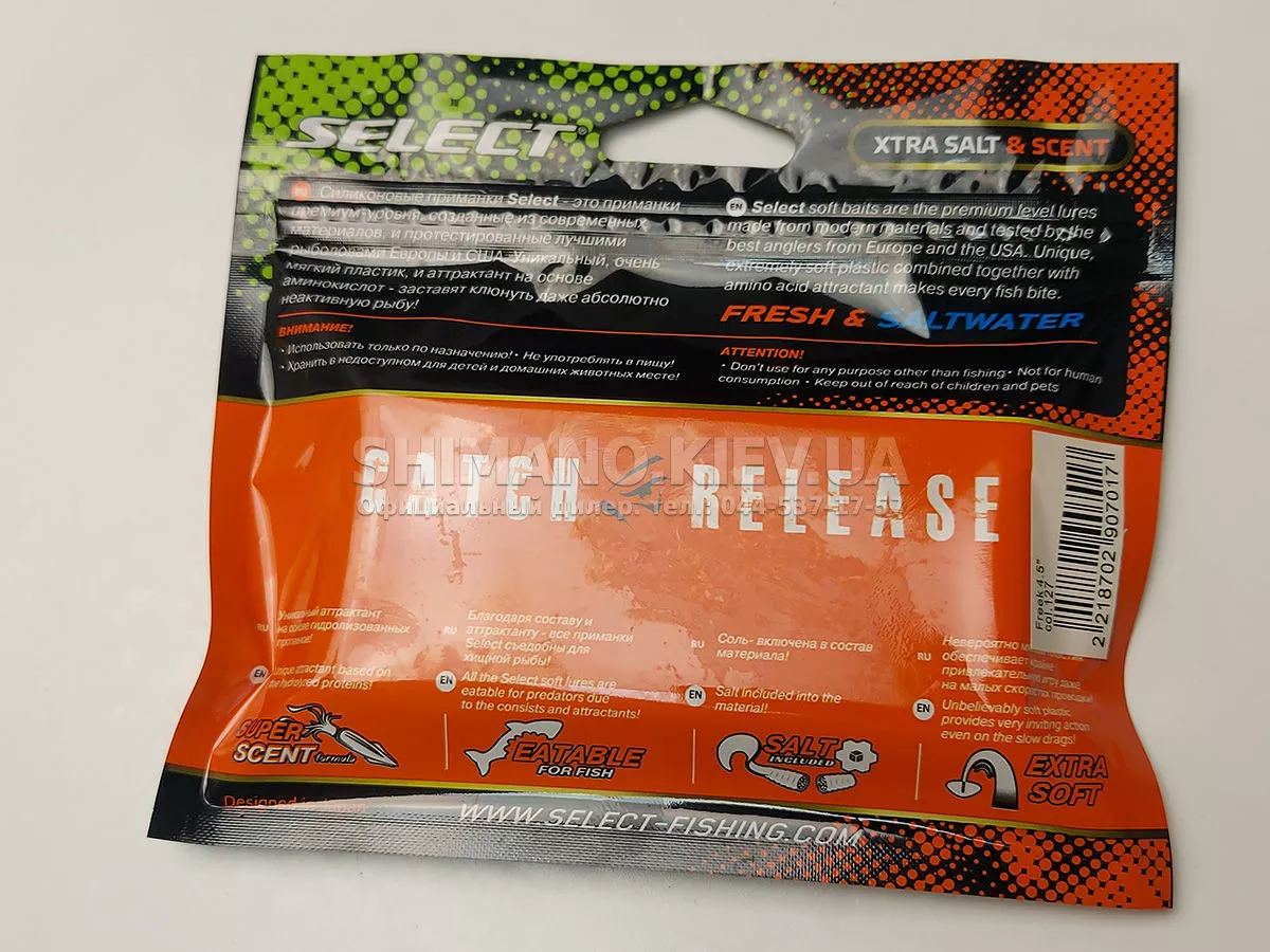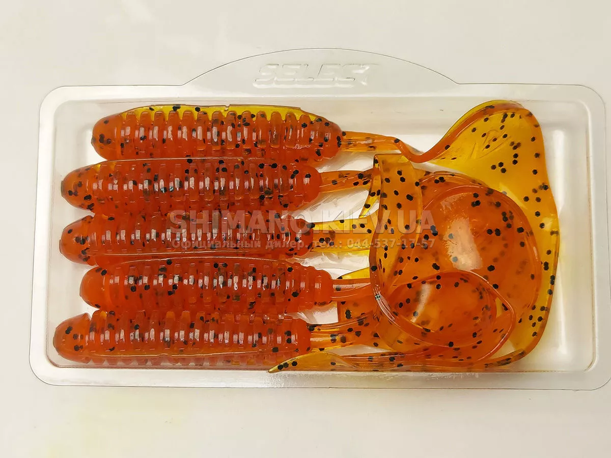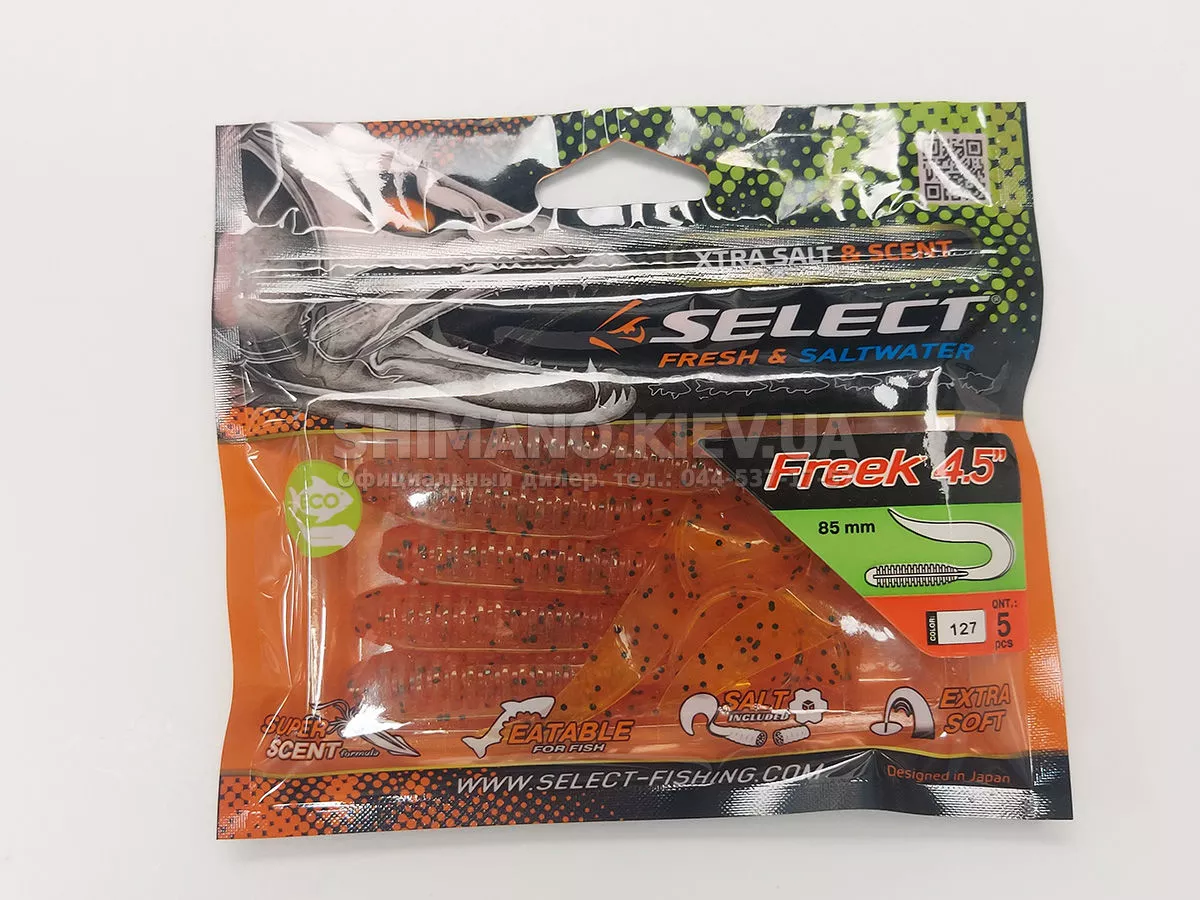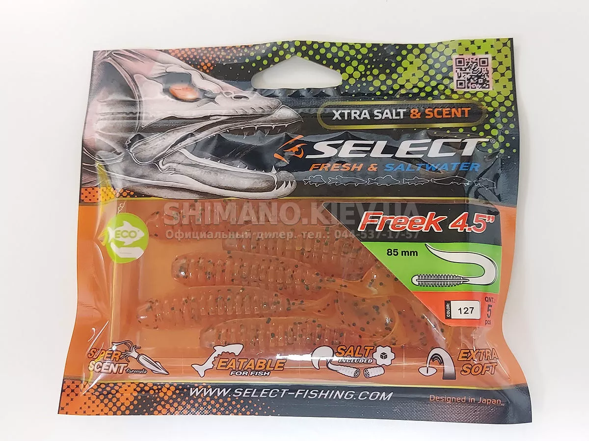 Найновіша приманка SELECT Freek. Її м'ясисте тіло та широкий хвіст ідеально підходять для лову судака, активного окуня та вічно голодної щуки. Незвичайна форма хвоста і спеціально підібраний силікон моментально включають приманку в гру як на будь-якій швидкості проводки, так і на підкиданні або в падінні. Все це дозволяє робити різну анімацію і успішно залучати хижака по будь-якій воді. Також варто відзначити, що більш щільне та широке тіло ідеально підходить для різних типів оснастки, включаючи класичний джиг та подвійні гачки. Для досягнення максимального ефекту рекомендуємо використовувати шарнірний монтаж: дроп-шот, кароліна, відвідний повідець або вантаж «чебурашка». Як завжди, представлена величезна гама кольорів і в майбутньому розмірів.