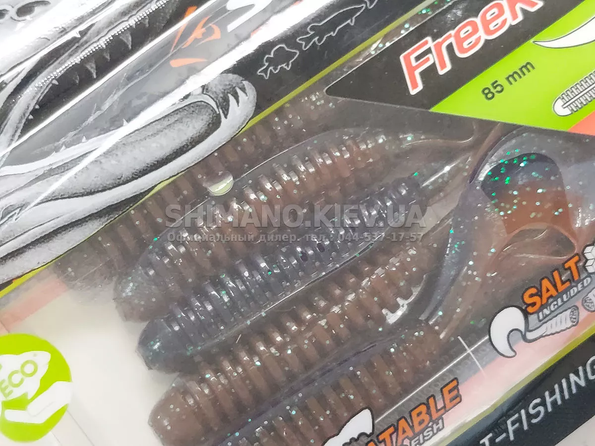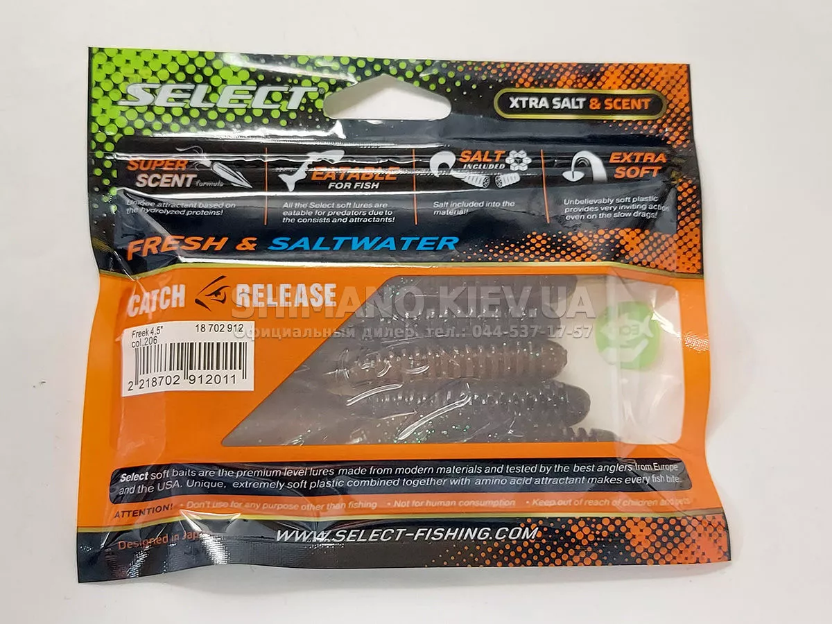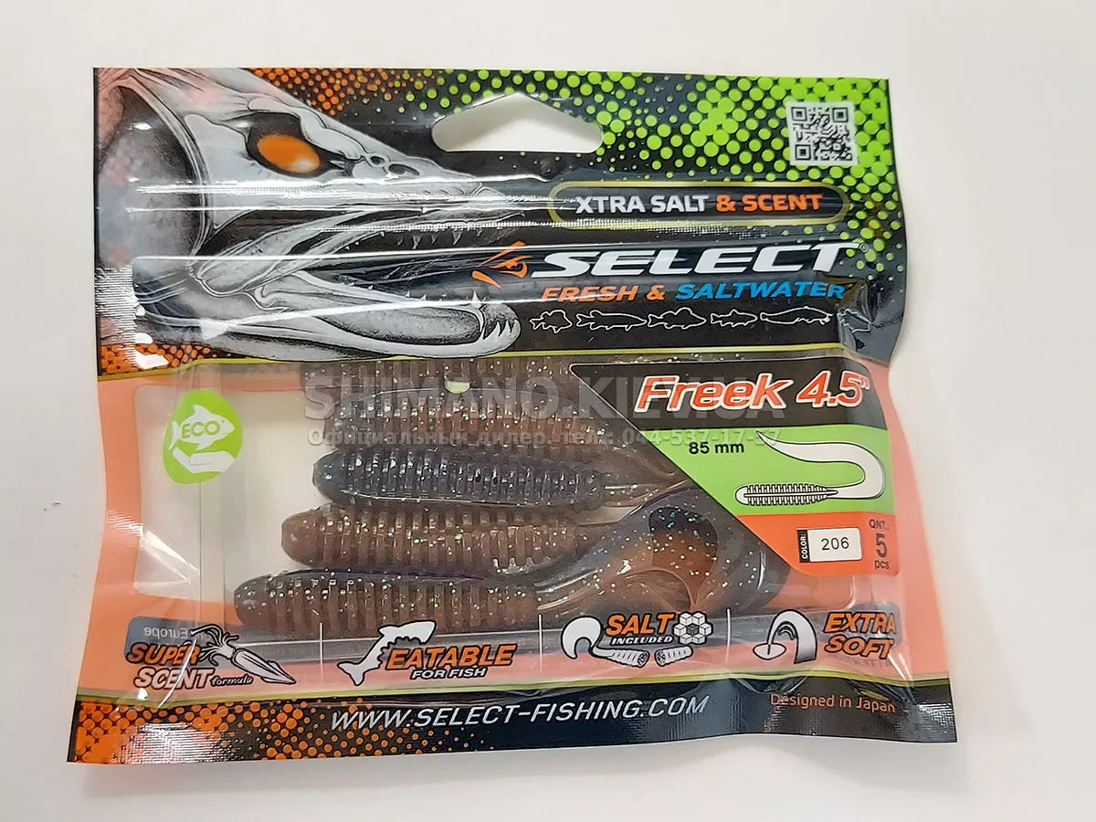 Найновіша приманка SELECT Freek. Її м'ясисте тіло та широкий хвіст ідеально підходять для лову судака, активного окуня та вічно голодної щуки. Незвичайна форма хвоста і спеціально підібраний силікон моментально включають приманку в гру як на будь-якій швидкості проводки, так і на підкиданні або в падінні. Все це дозволяє робити різну анімацію і успішно залучати хижака по будь-якій воді. Також варто відзначити, що більш щільне та широке тіло ідеально підходить для різних типів оснастки, включаючи класичний джиг та подвійні гачки. Для досягнення максимального ефекту рекомендуємо використовувати шарнірний монтаж: дроп-шот, кароліна, відвідний повідець або вантаж «чебурашка». Як завжди, представлена величезна гама кольорів і в майбутньому розмірів.