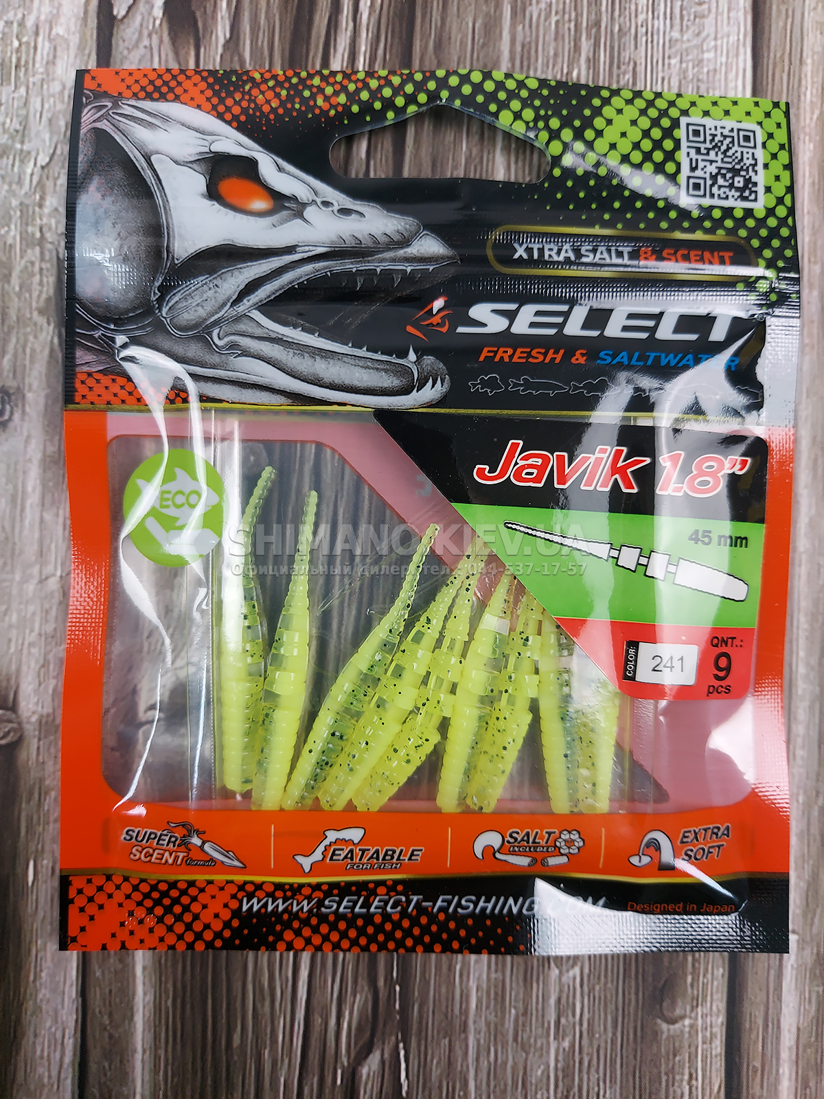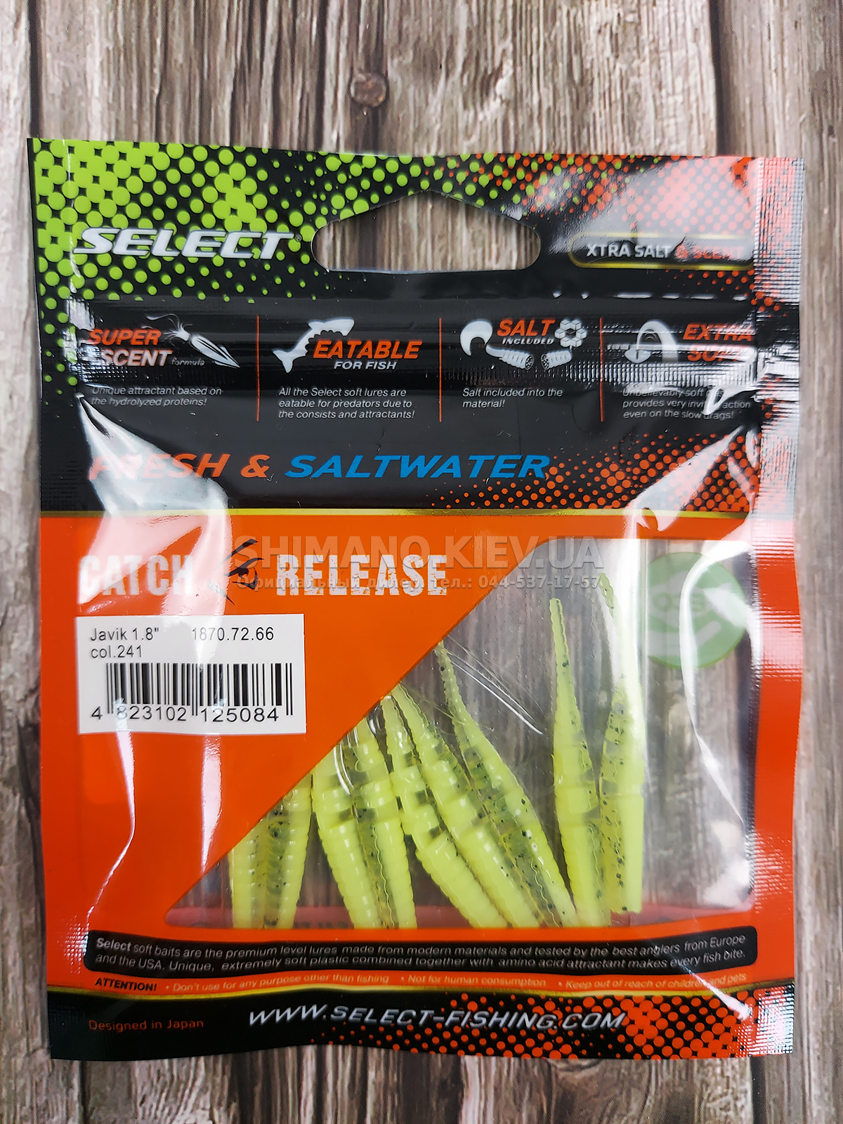 Select Javik є відмінним прикладом імітації черв'яка складної форми, що входить до раціону харчування більшості прісноводних риб. Принади, що розташовуються на серединно-хвостовому ділянці, витончені сегменти дозволяють реалізовувати природні рухи червоподібних, а високі їстівні властивості силіконового матеріалу виступають додатковим фактором до атаки приманки підводними мешканцями.