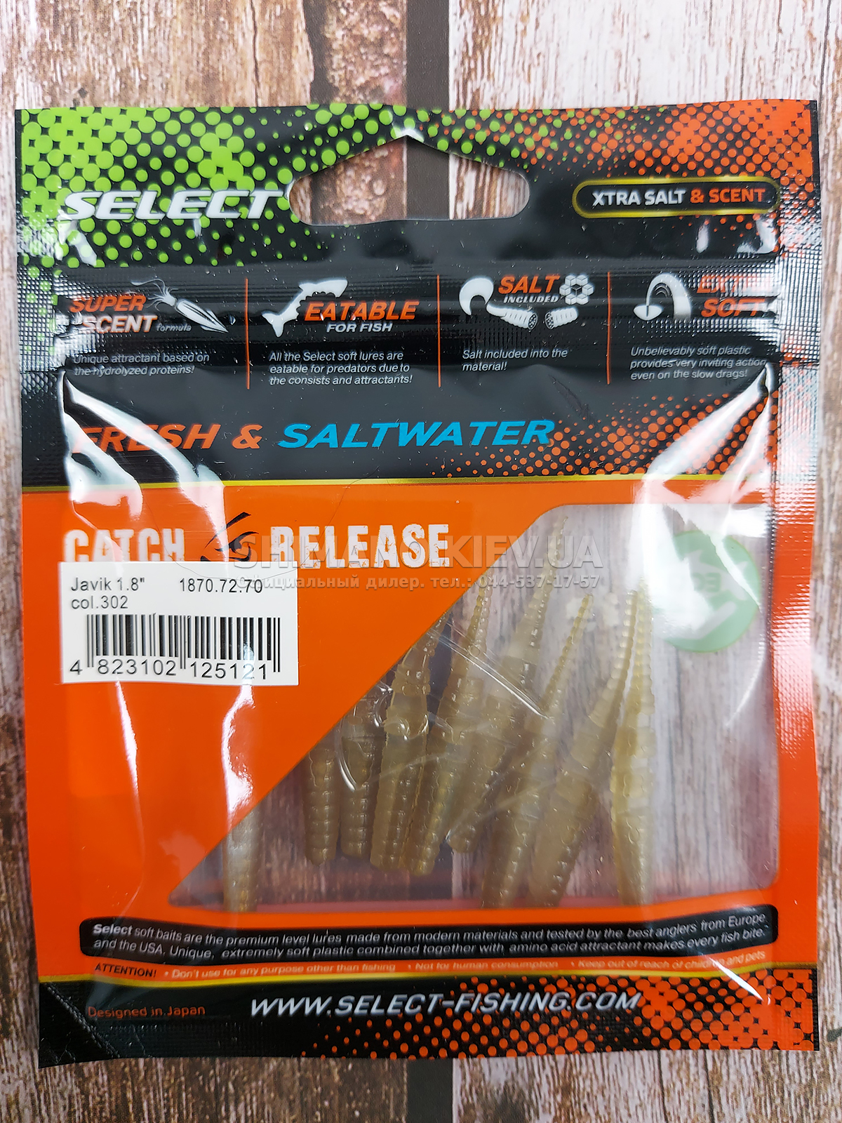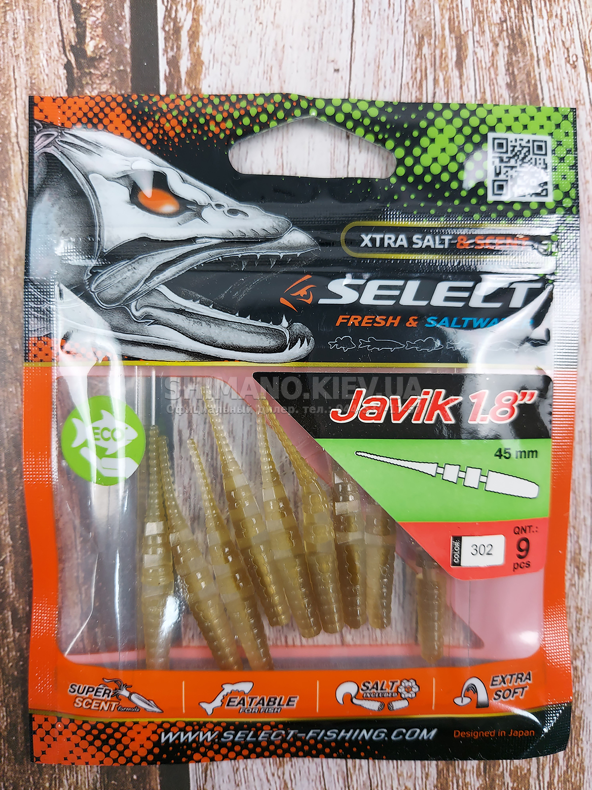 Select Javik є відмінним прикладом імітації черв'яка складної форми, що входить до раціону харчування більшості прісноводних риб. Принади, що розташовуються на серединно-хвостовому ділянці, витончені сегменти дозволяють реалізовувати природні рухи червоподібних, а високі їстівні властивості силіконового матеріалу виступають додатковим фактором до атаки приманки підводними мешканцями.