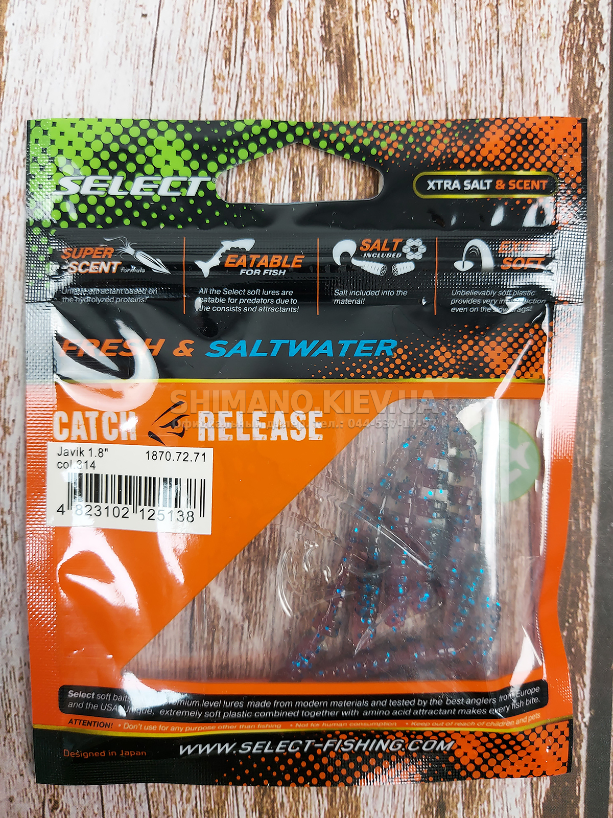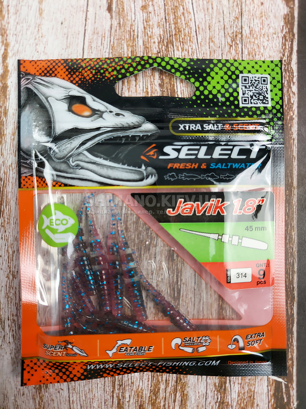 Select Javik є відмінним прикладом імітації черв'яка складної форми, що входить до раціону харчування більшості прісноводних риб. Принади, що розташовуються на серединно-хвостовому ділянці, витончені сегменти дозволяють реалізовувати природні рухи червоподібних, а високі їстівні властивості силіконового матеріалу виступають додатковим фактором до атаки приманки підводними мешканцями.
