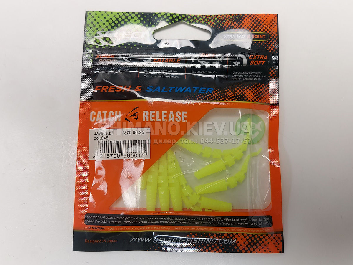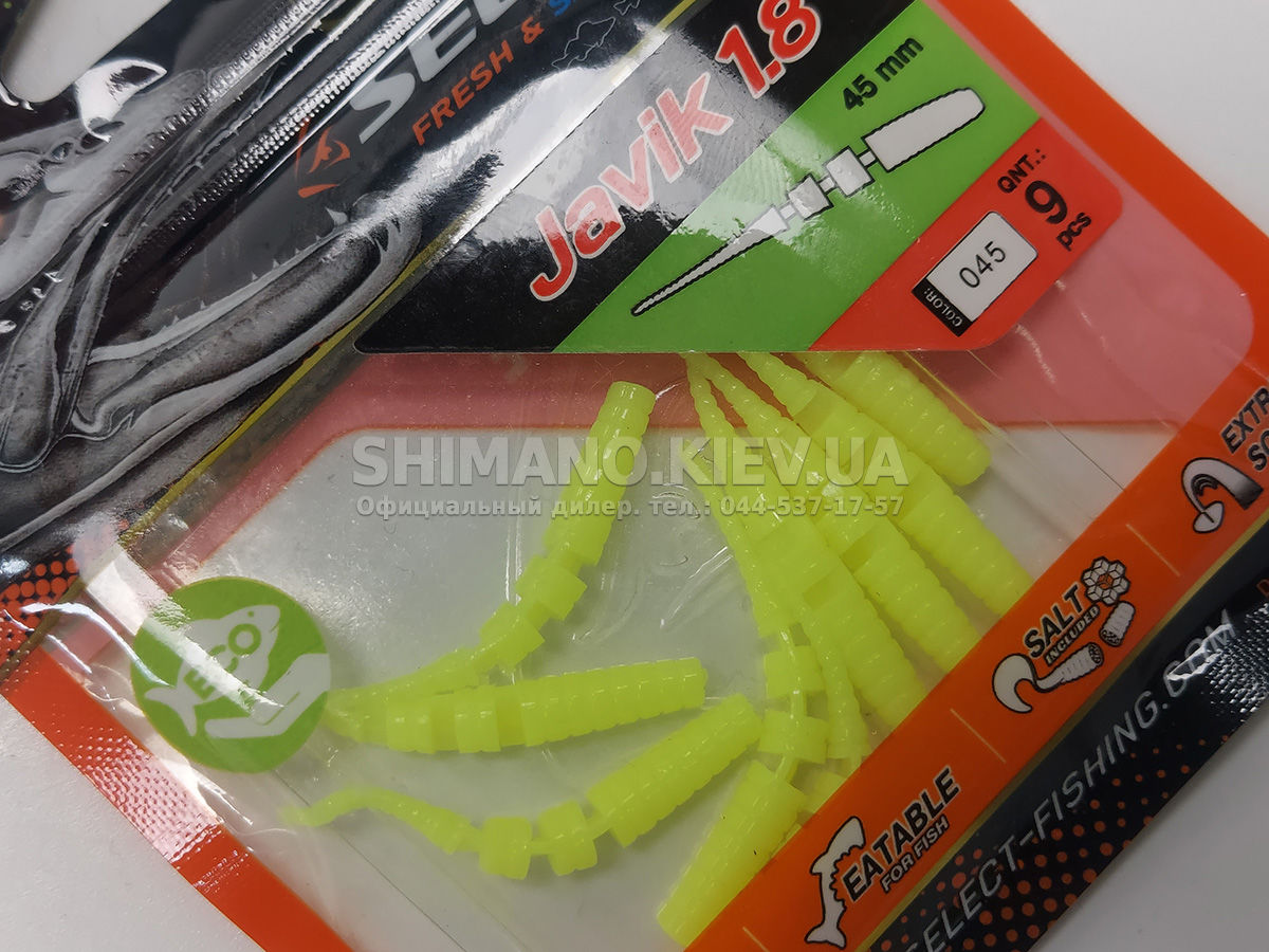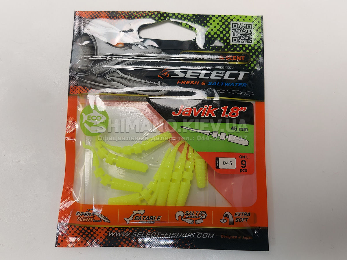 Select Javik є відмінним прикладом імітації черв'яка складної форми, що входить до раціону харчування більшості прісноводних риб. Принади, що розташовуються на серединно-хвостовому ділянці, витончені сегменти дозволяють реалізовувати природні рухи червоподібних, а високі їстівні властивості силіконового матеріалу виступають додатковим фактором до атаки приманки підводними мешканцями.