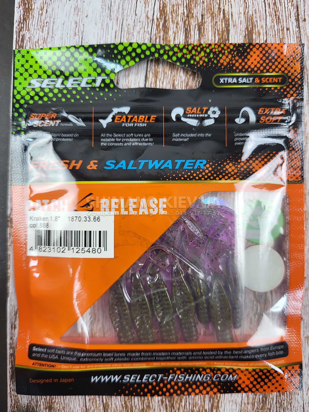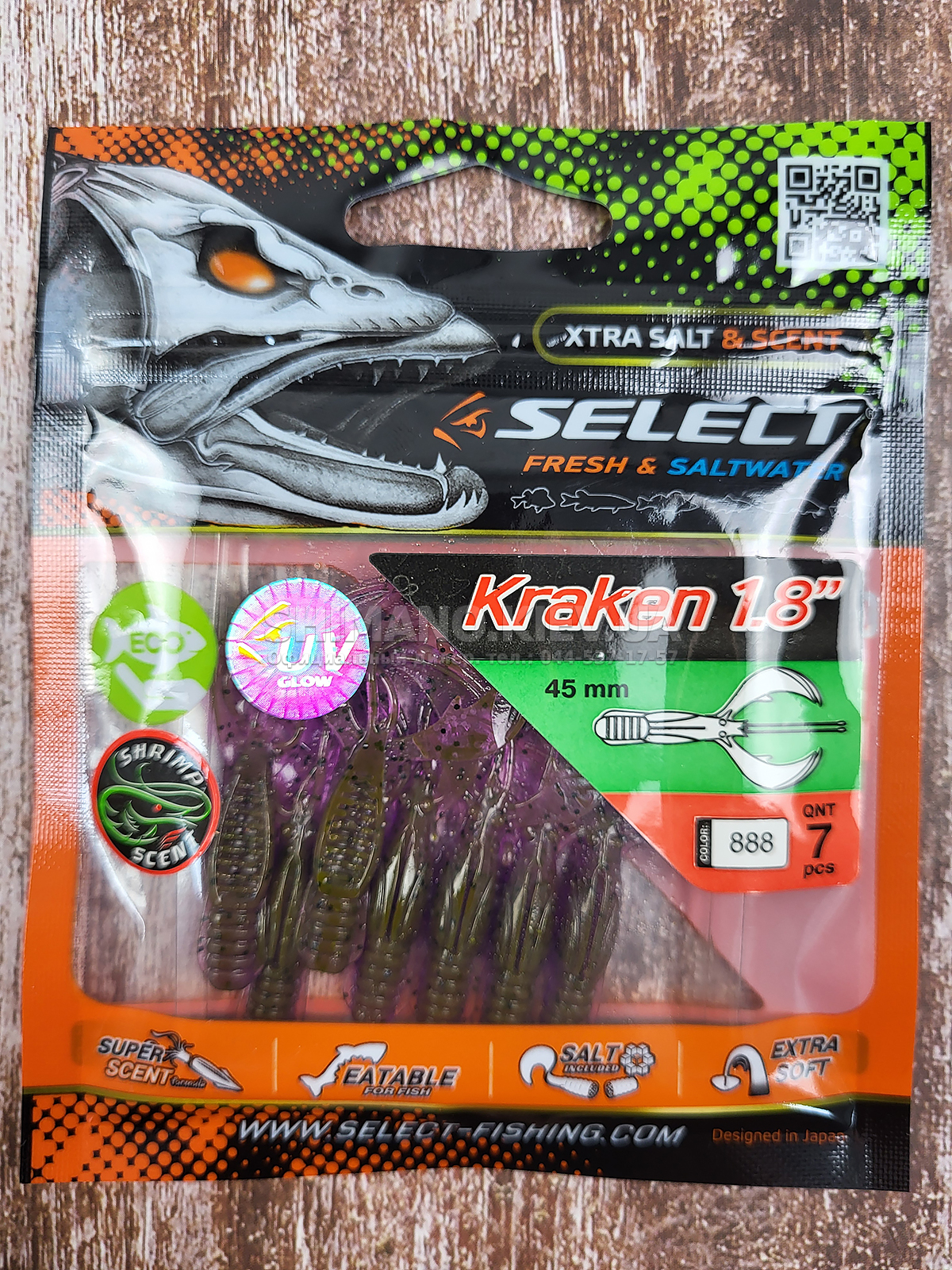 Силікон Select Kraken - імітація ракоподібних з активними клешнями, які дуже спокусливо грають на рівномірній проводці. Тіло приманки відносно широке і злегка приплюснуте, це зроблено для того, щоб збільшити час її зависання на паузі. Невеликі вуса з потовщеннями на кінцях дозволять приваблювати рибу навіть на найделікатніших проводках і під час протягування по дну. У верхній частині силікону є спеціальний проріз під офсетний гачок. Рак Select Kraken можна віднести до універсальних джигових приманок, так як з його допомогою можна з успіхом ловити практично будь-яку хижу рибу з використанням різних видів монтажів - шарнірних і рознесених.