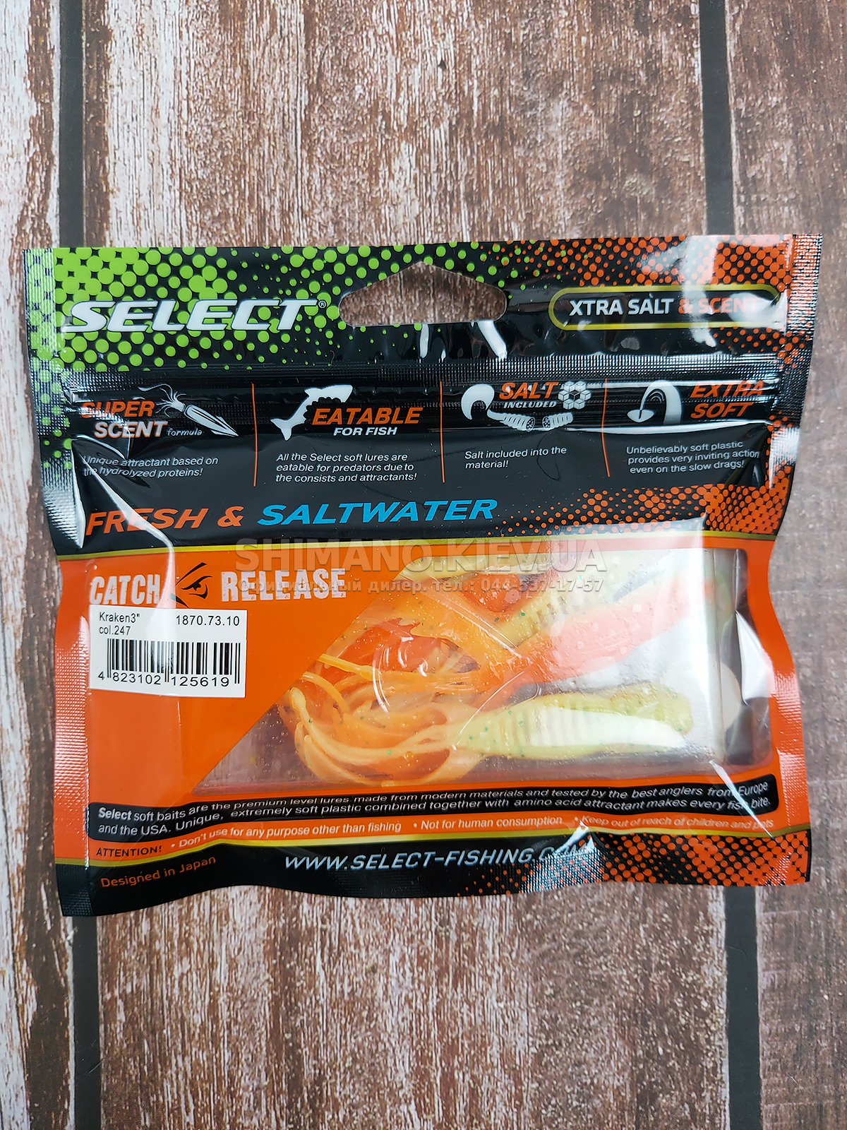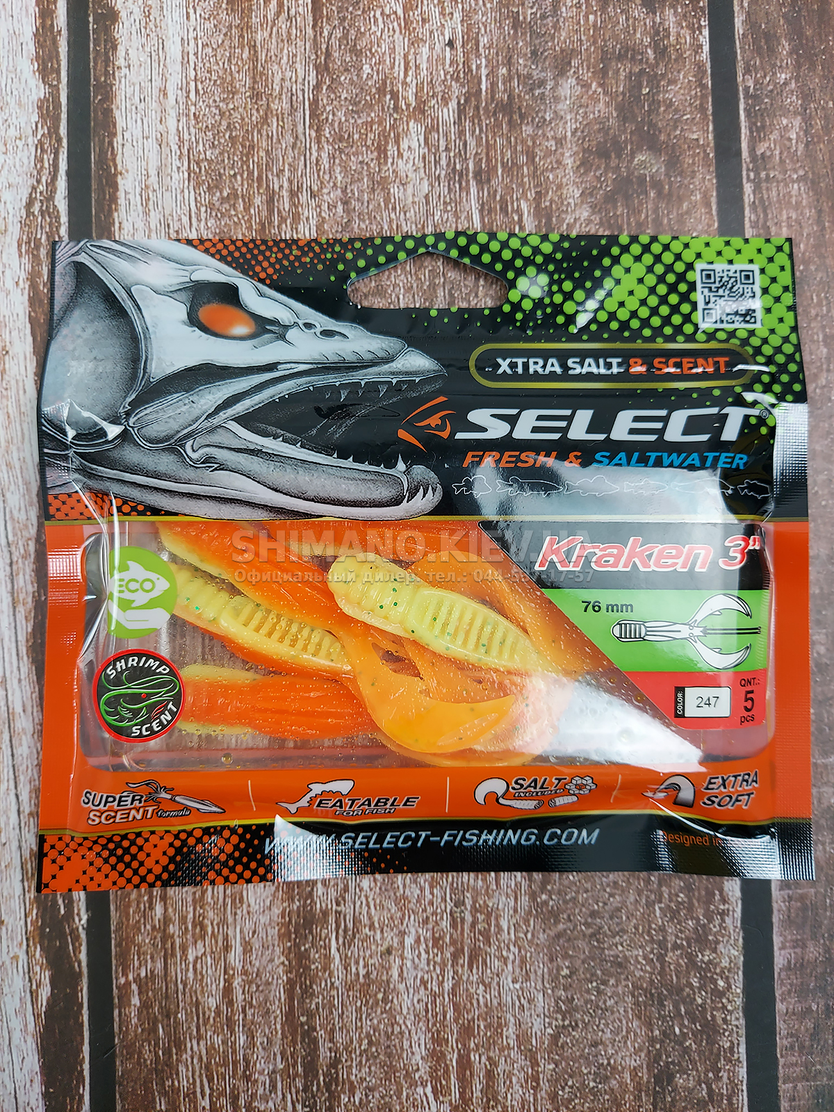 Силікон Select Kraken - імітація ракоподібних з активними клешнями, які дуже спокусливо грають на рівномірній проводці. Тіло приманки відносно широке і злегка приплюснуте, це зроблено для того, щоб збільшити час її зависання на паузі. Невеликі вуса з потовщеннями на кінцях дозволять приваблювати рибу навіть на найделікатніших проводках і під час протягування по дну. У верхній частині силікону є спеціальний проріз під офсетний гачок. Рак Select Kraken можна віднести до універсальних джигових приманок, так як з його допомогою можна з успіхом ловити практично будь-яку хижу рибу з використанням різних видів монтажів - шарнірних і рознесених.