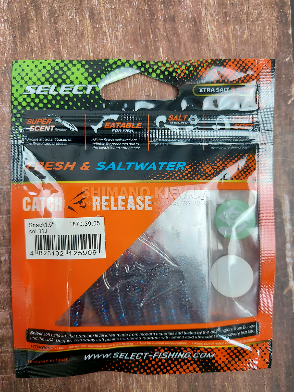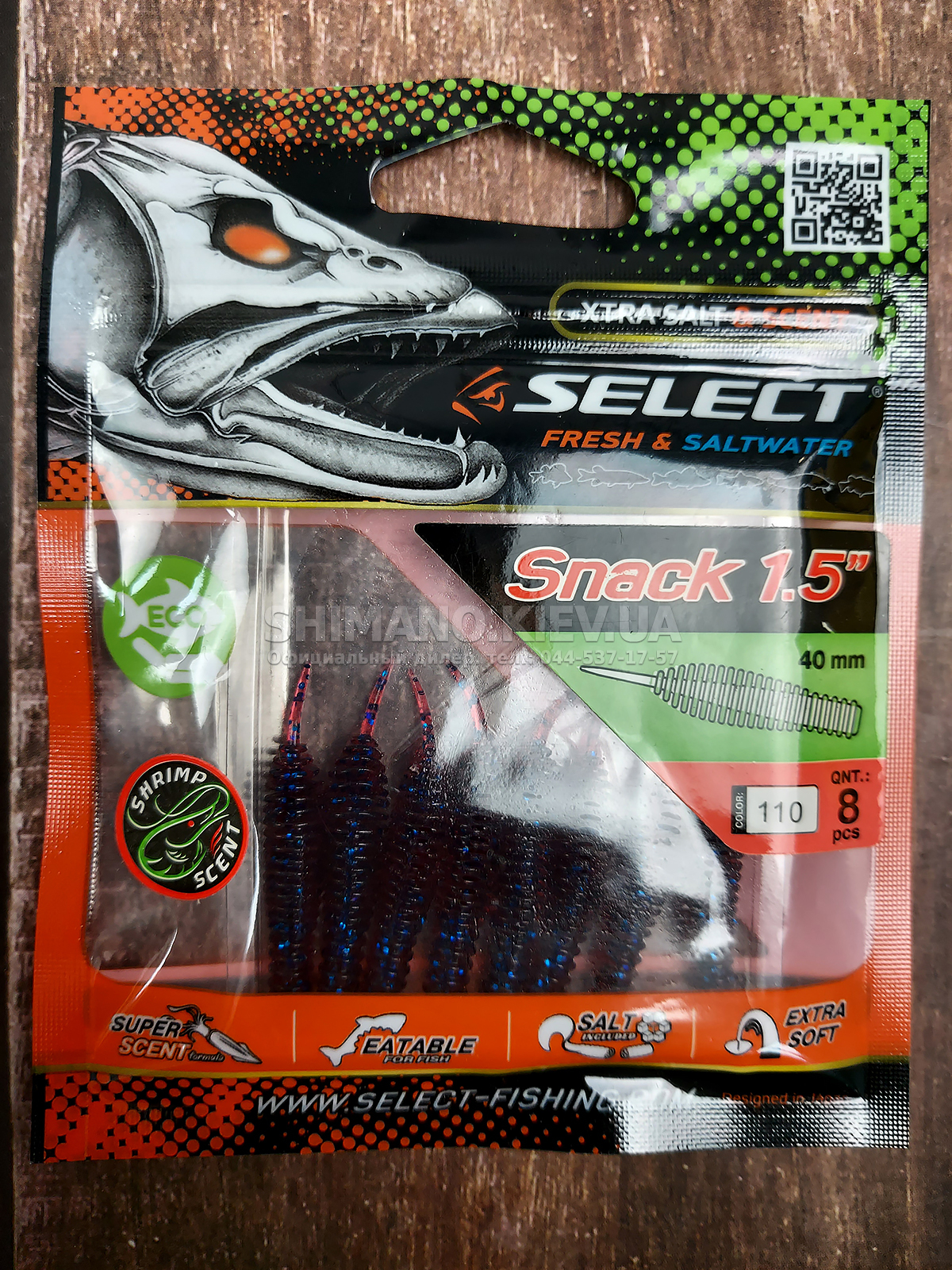 Силікон Select Snack - апетитний товстенький черв’як з дуже об'ємним ребристим хвостом. Завдяки великій кількості сегментів, на проводці він має дуже реалістичні коливання. Особливість цієї конструкції в тому, що в глибоких ребрах затримуються бульбашки повітря, які на паузі піднімають хвіст приманки майже вертикально вгору. Найрезультативніший монтаж для Snack-а – це шарнір з одинарним або офсетним гачком. Також можна використовувати відносно короткий двійник, бажано з тонкого дроту, щоб не порушувати анімацію черв’яка. Носова частина приманки досить широка, що дозволяє їй надійно утримуватись на гачку і менше сповзати під час клювання. В тілі силікону є спеціальний паз, щоб ховати жало офсетного гачка від корчів під час риболовлі в "складних" місцях. Основними трофеями Select Snack є окунь та судак різного розміру. А тому, крім вищевказаних монтажів, не варто забувати про такі оснащення як дропшот або відвідний поводок.