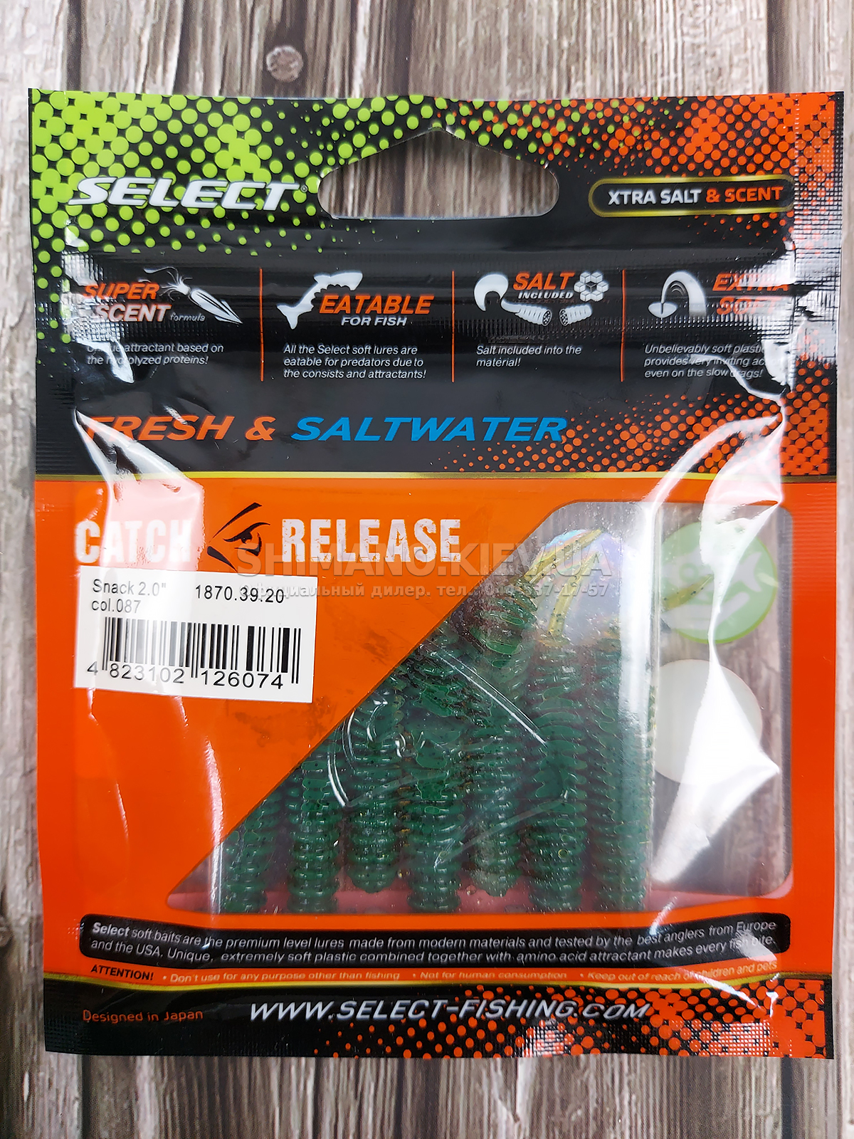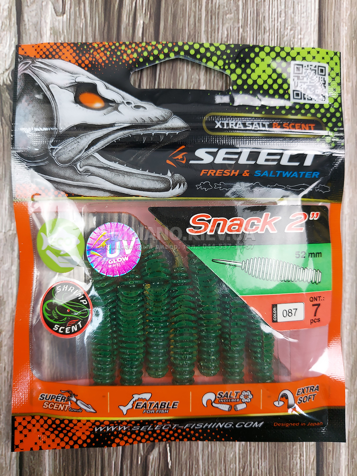 Силікон Select Snack - апетитний товстенький черв’як з дуже об'ємним ребристим хвостом. Завдяки великій кількості сегментів, на проводці він має дуже реалістичні коливання. Особливість цієї конструкції в тому, що в глибоких ребрах затримуються бульбашки повітря, які на паузі піднімають хвіст приманки майже вертикально вгору. Найрезультативніший монтаж для Snack-а – це шарнір з одинарним або офсетним гачком. Також можна використовувати відносно короткий двійник, бажано з тонкого дроту, щоб не порушувати анімацію черв’яка. Носова частина приманки досить широка, що дозволяє їй надійно утримуватись на гачку і менше сповзати під час клювання. В тілі силікону є спеціальний паз, щоб ховати жало офсетного гачка від корчів під час риболовлі в "складних" місцях. Основними трофеями Select Snack є окунь та судак різного розміру. А тому, крім вищевказаних монтажів, не варто забувати про такі оснащення як дропшот або відвідний поводок.