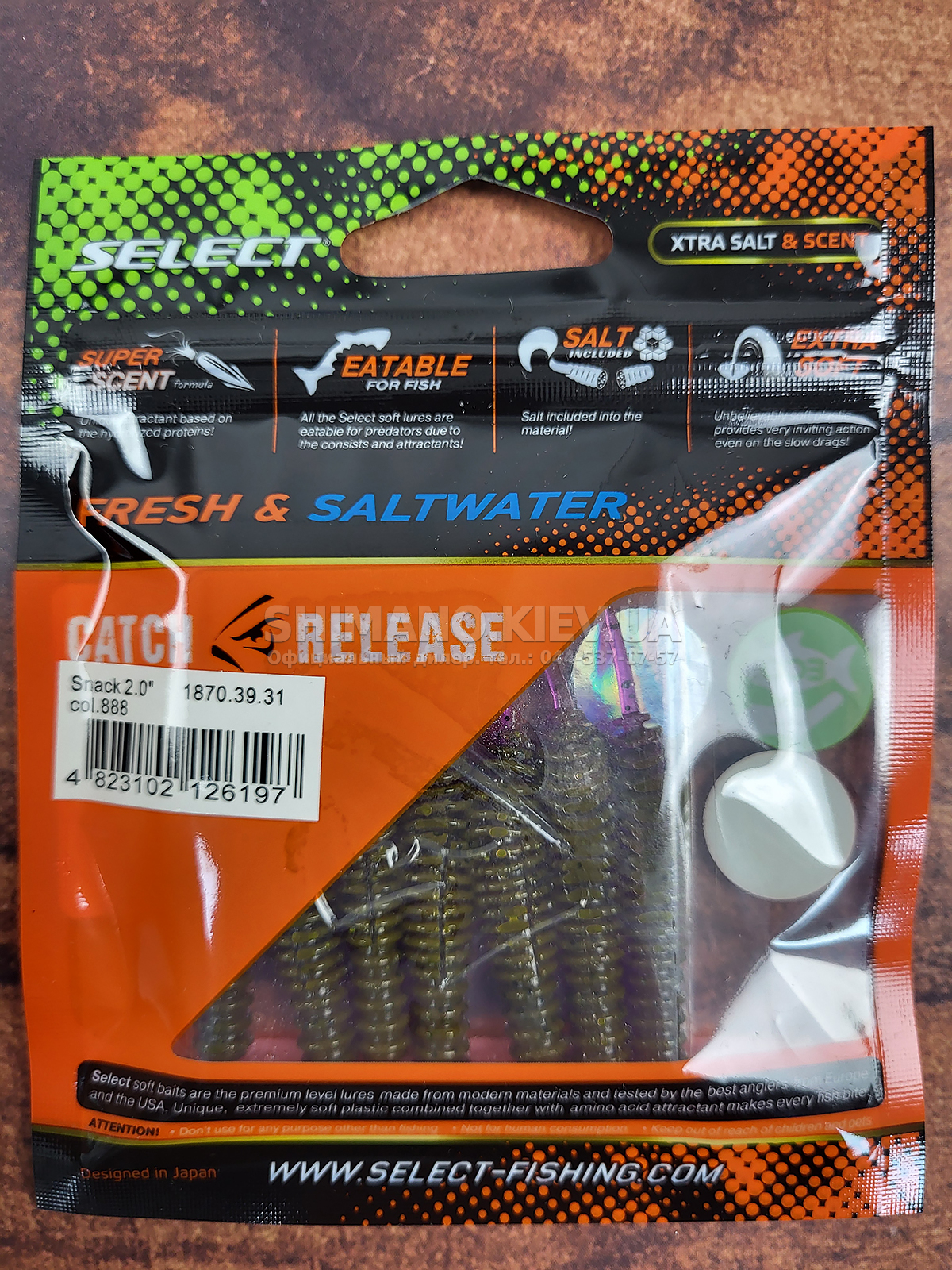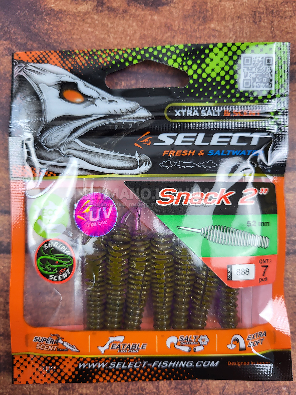 Силікон Select Snack - апетитний товстенький черв’як з дуже об'ємним ребристим хвостом. Завдяки великій кількості сегментів, на проводці він має дуже реалістичні коливання. Особливість цієї конструкції в тому, що в глибоких ребрах затримуються бульбашки повітря, які на паузі піднімають хвіст приманки майже вертикально вгору. Найрезультативніший монтаж для Snack-а – це шарнір з одинарним або офсетним гачком. Також можна використовувати відносно короткий двійник, бажано з тонкого дроту, щоб не порушувати анімацію черв’яка. Носова частина приманки досить широка, що дозволяє їй надійно утримуватись на гачку і менше сповзати під час клювання. В тілі силікону є спеціальний паз, щоб ховати жало офсетного гачка від корчів під час риболовлі в "складних" місцях. Основними трофеями Select Snack є окунь та судак різного розміру. А тому, крім вищевказаних монтажів, не варто забувати про такі оснащення як дропшот або відвідний поводок.