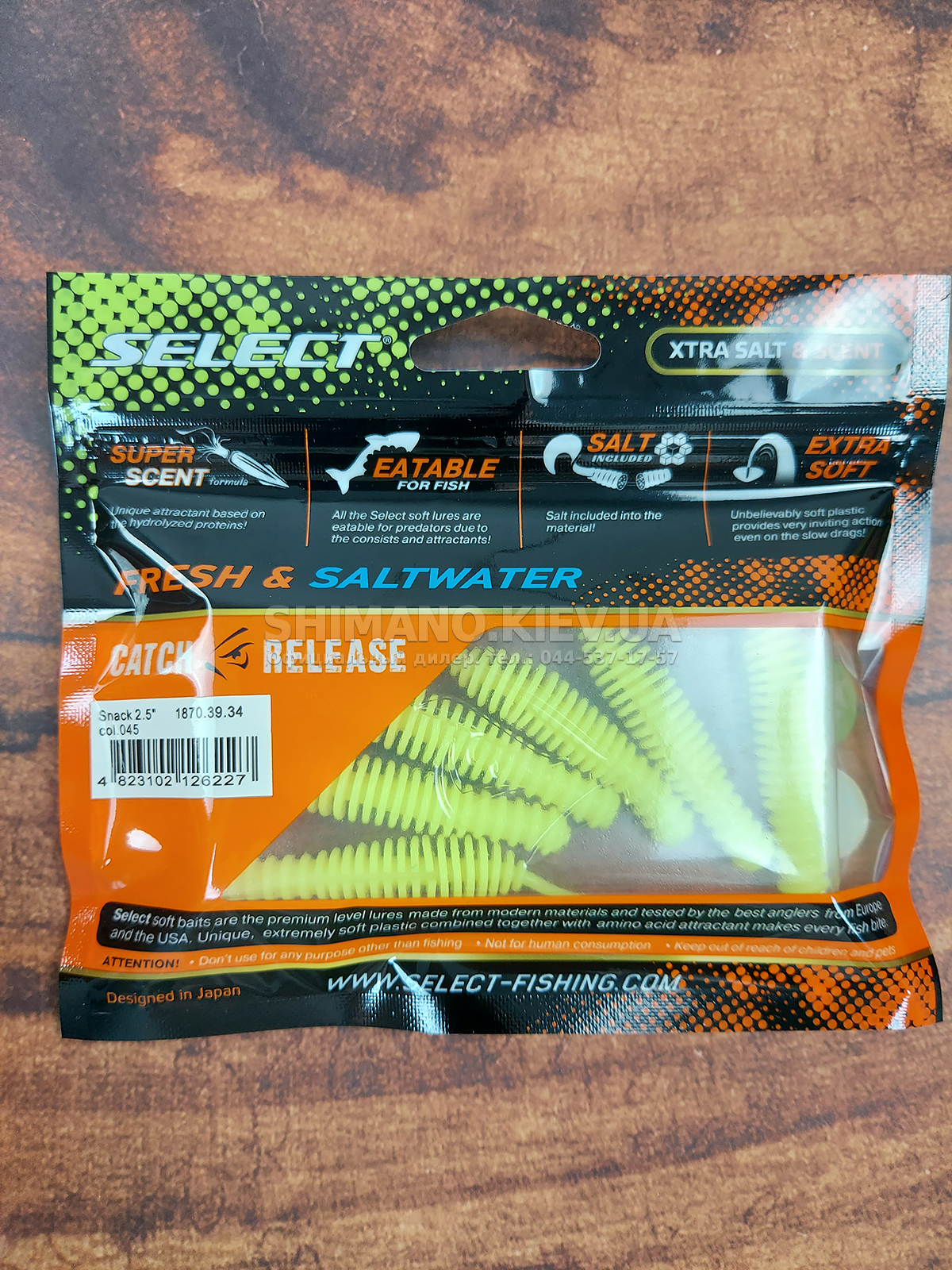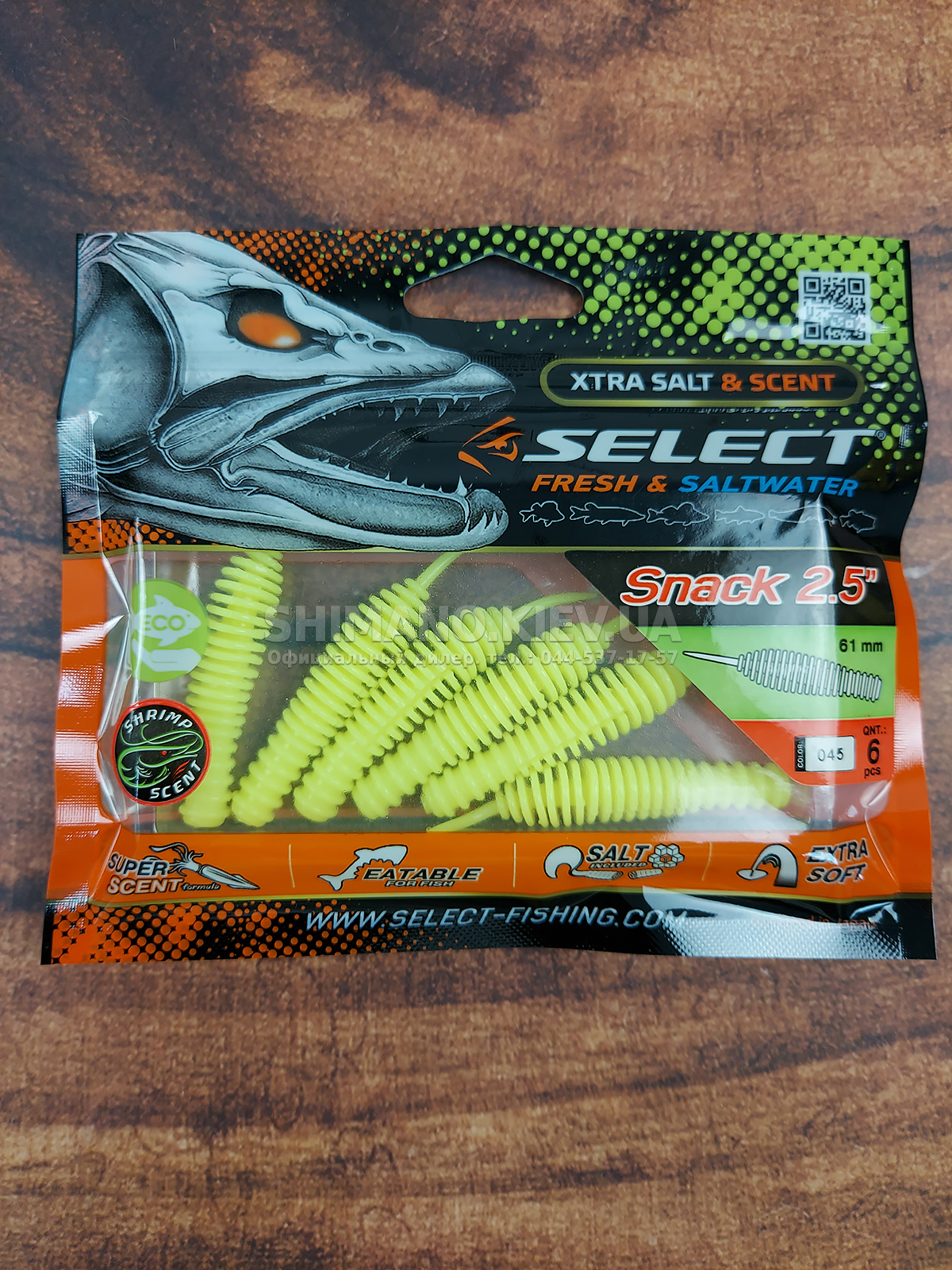 Силікон Select Snack - апетитний товстенький черв’як з дуже об'ємним ребристим хвостом. Завдяки великій кількості сегментів, на проводці він має дуже реалістичні коливання. Особливість цієї конструкції в тому, що в глибоких ребрах затримуються бульбашки повітря, які на паузі піднімають хвіст приманки майже вертикально вгору. Найрезультативніший монтаж для Snack-а – це шарнір з одинарним або офсетним гачком. Також можна використовувати відносно короткий двійник, бажано з тонкого дроту, щоб не порушувати анімацію черв’яка. Носова частина приманки досить широка, що дозволяє їй надійно утримуватись на гачку і менше сповзати під час клювання. В тілі силікону є спеціальний паз, щоб ховати жало офсетного гачка від корчів під час риболовлі в "складних" місцях. Основними трофеями Select Snack є окунь та судак різного розміру. А тому, крім вищевказаних монтажів, не варто забувати про такі оснащення як дропшот або відвідний поводок.