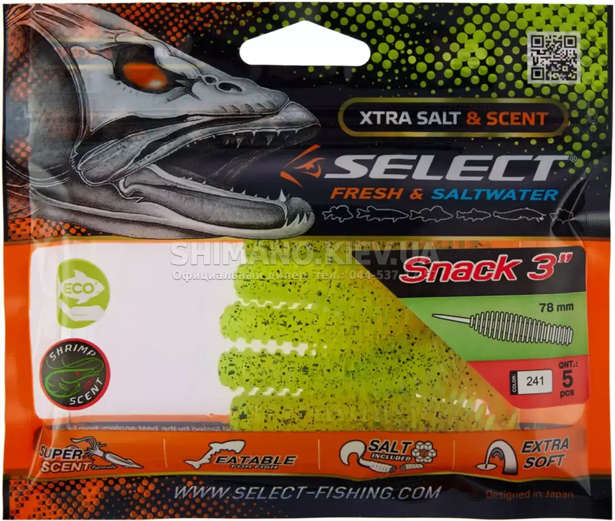 Силікон Select Snack - апетитний товстенький черв’як з дуже об'ємним ребристим хвостом. Завдяки великій кількості сегментів, на проводці він має дуже реалістичні коливання. Особливість цієї конструкції в тому, що в глибоких ребрах затримуються бульбашки повітря, які на паузі піднімають хвіст приманки майже вертикально вгору. Найрезультативніший монтаж для Snack-а – це шарнір з одинарним або офсетним гачком. Також можна використовувати відносно короткий двійник, бажано з тонкого дроту, щоб не порушувати анімацію черв’яка. Носова частина приманки досить широка, що дозволяє їй надійно утримуватись на гачку і менше сповзати під час клювання. В тілі силікону є спеціальний паз, щоб ховати жало офсетного гачка від корчів під час риболовлі в "складних" місцях. Основними трофеями Select Snack є окунь та судак різного розміру. А тому, крім вищевказаних монтажів, не варто забувати про такі оснащення як дропшот або відвідний поводок.