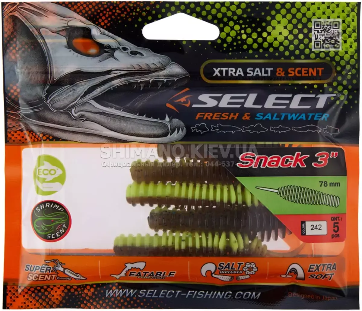 Силікон Select Snack - апетитний товстенький черв’як з дуже об'ємним ребристим хвостом. Завдяки великій кількості сегментів, на проводці він має дуже реалістичні коливання. Особливість цієї конструкції в тому, що в глибоких ребрах затримуються бульбашки повітря, які на паузі піднімають хвіст приманки майже вертикально вгору. Найрезультативніший монтаж для Snack-а – це шарнір з одинарним або офсетним гачком. Також можна використовувати відносно короткий двійник, бажано з тонкого дроту, щоб не порушувати анімацію черв’яка. Носова частина приманки досить широка, що дозволяє їй надійно утримуватись на гачку і менше сповзати під час клювання. В тілі силікону є спеціальний паз, щоб ховати жало офсетного гачка від корчів під час риболовлі в "складних" місцях. Основними трофеями Select Snack є окунь та судак різного розміру. А тому, крім вищевказаних монтажів, не варто забувати про такі оснащення як дропшот або відвідний поводок.