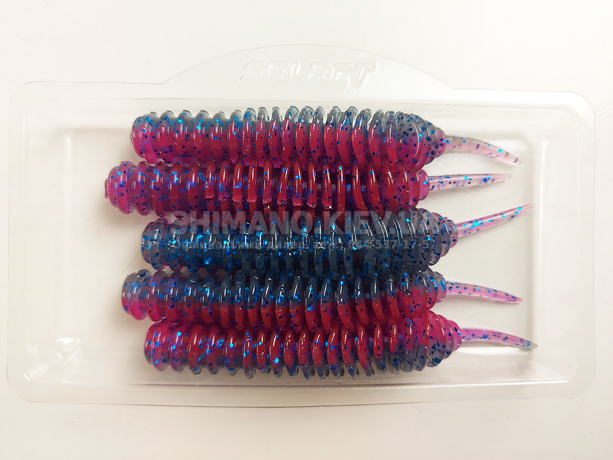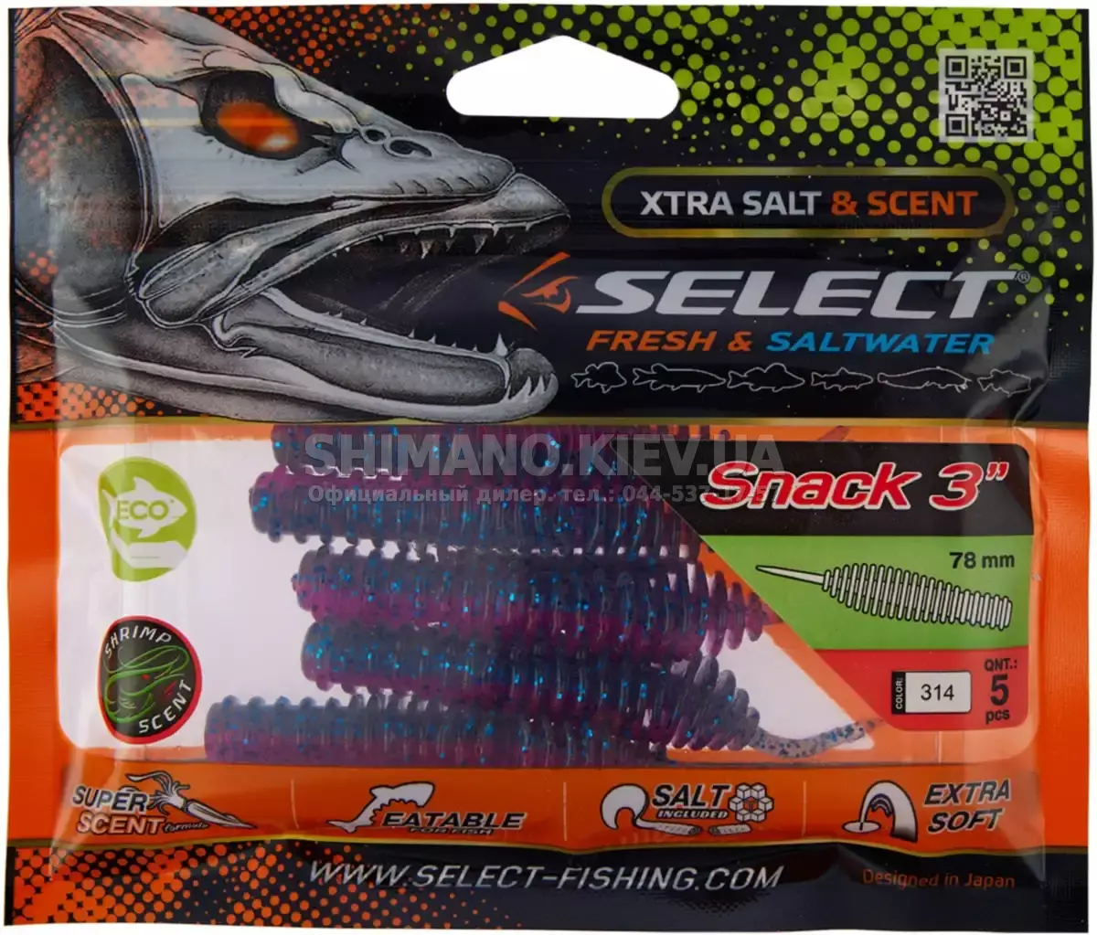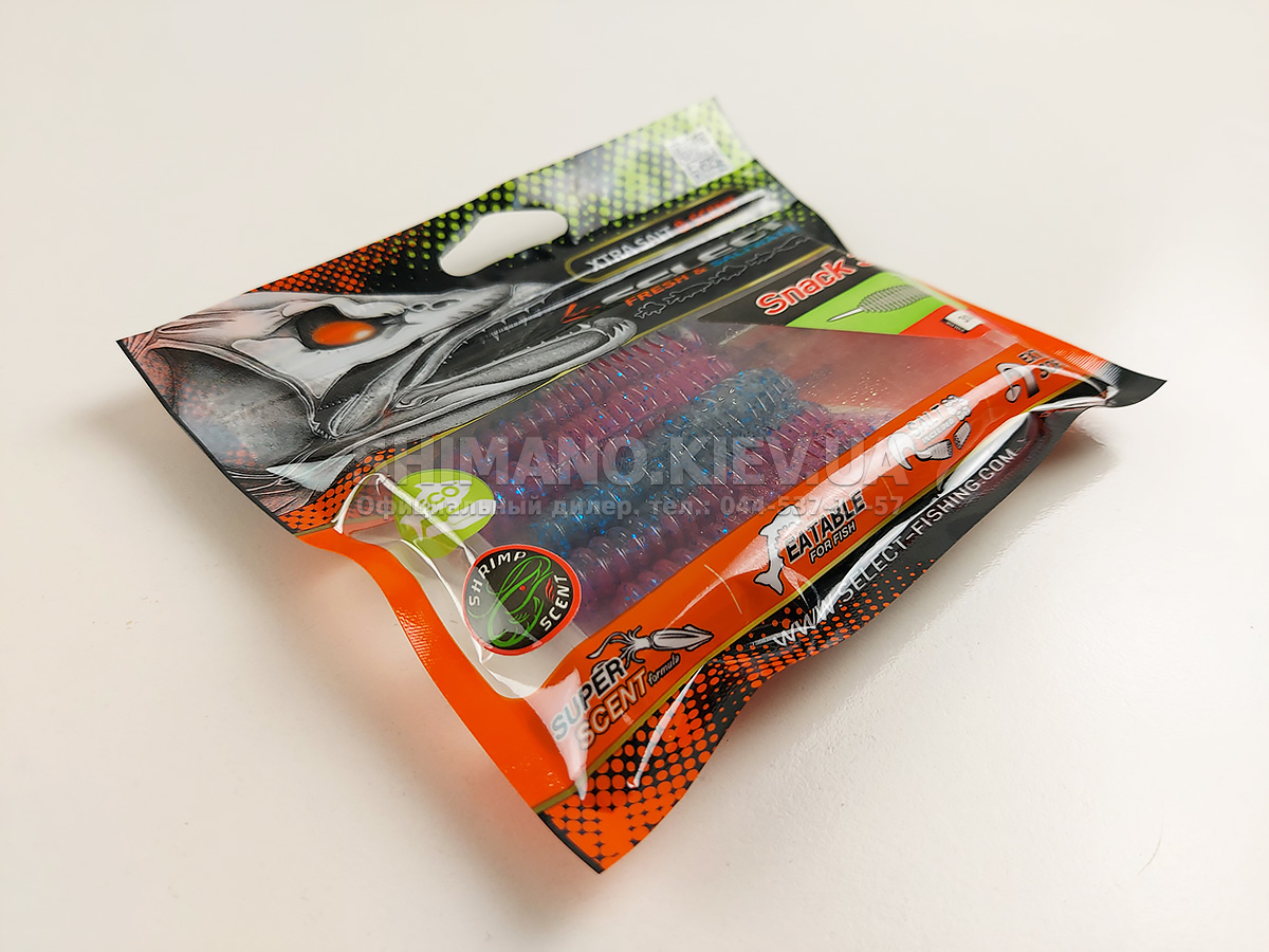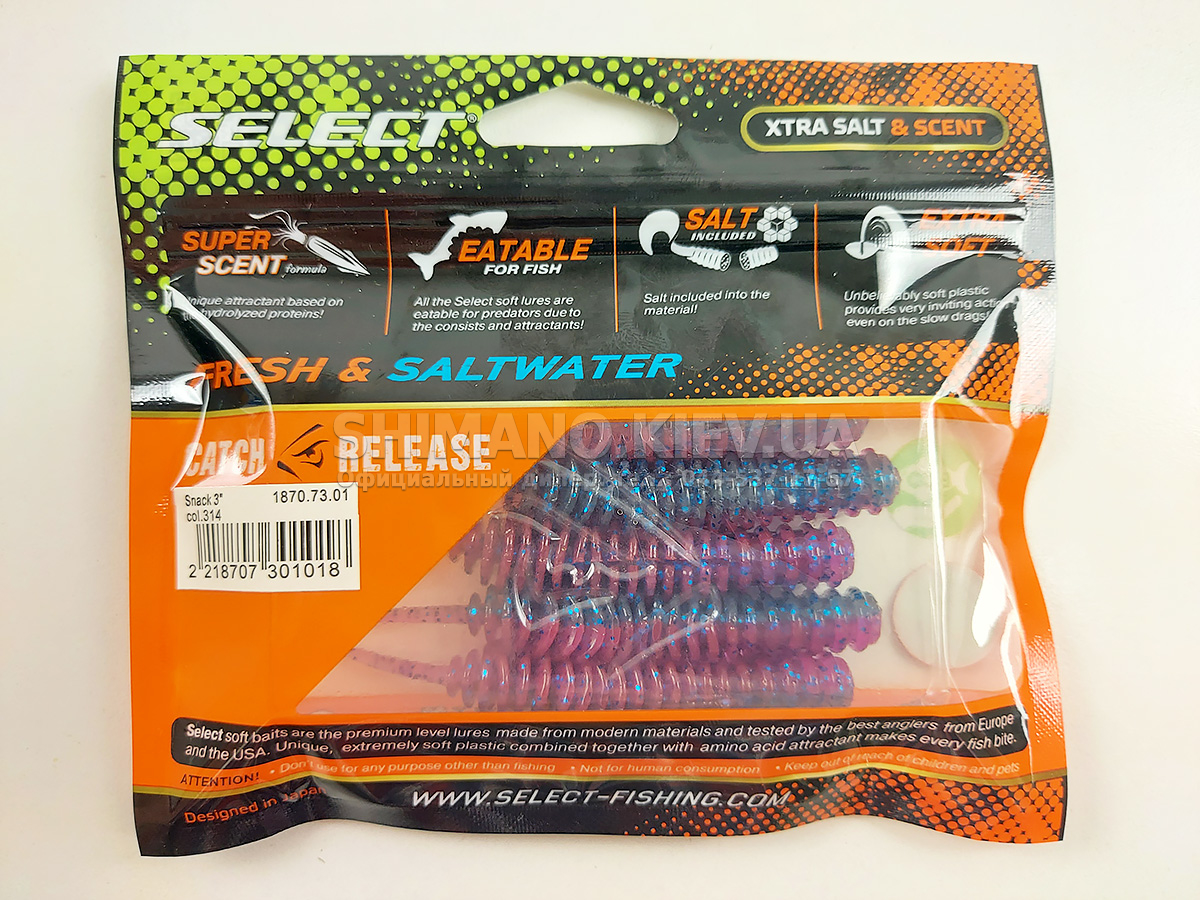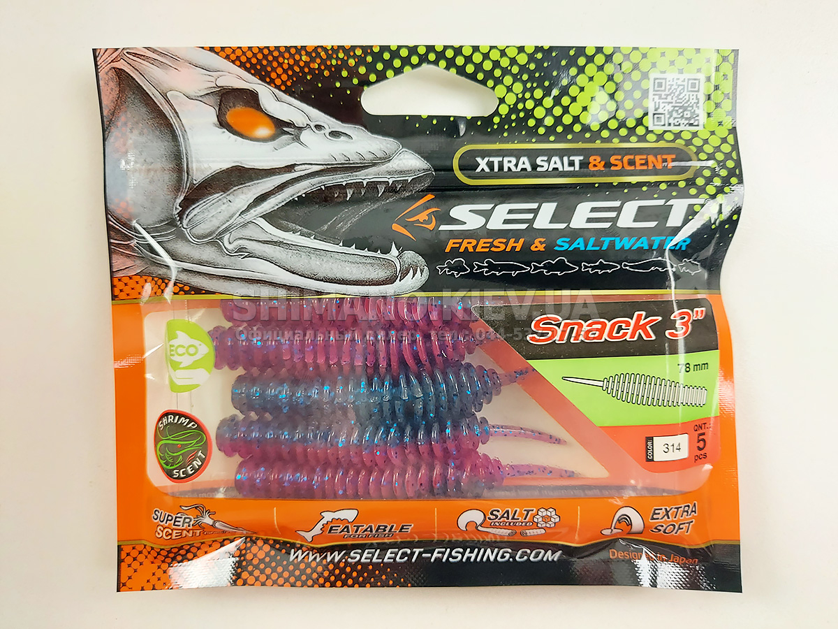 Силікон Select Snack - апетитний товстенький черв’як з дуже об'ємним ребристим хвостом. Завдяки великій кількості сегментів, на проводці він має дуже реалістичні коливання. Особливість цієї конструкції в тому, що в глибоких ребрах затримуються бульбашки повітря, які на паузі піднімають хвіст приманки майже вертикально вгору. Найрезультативніший монтаж для Snack-а – це шарнір з одинарним або офсетним гачком. Також можна використовувати відносно короткий двійник, бажано з тонкого дроту, щоб не порушувати анімацію черв’яка. Носова частина приманки досить широка, що дозволяє їй надійно утримуватись на гачку і менше сповзати під час клювання. В тілі силікону є спеціальний паз, щоб ховати жало офсетного гачка від корчів під час риболовлі в "складних" місцях. Основними трофеями Select Snack є окунь та судак різного розміру. А тому, крім вищевказаних монтажів, не варто забувати про такі оснащення як дропшот або відвідний поводок.