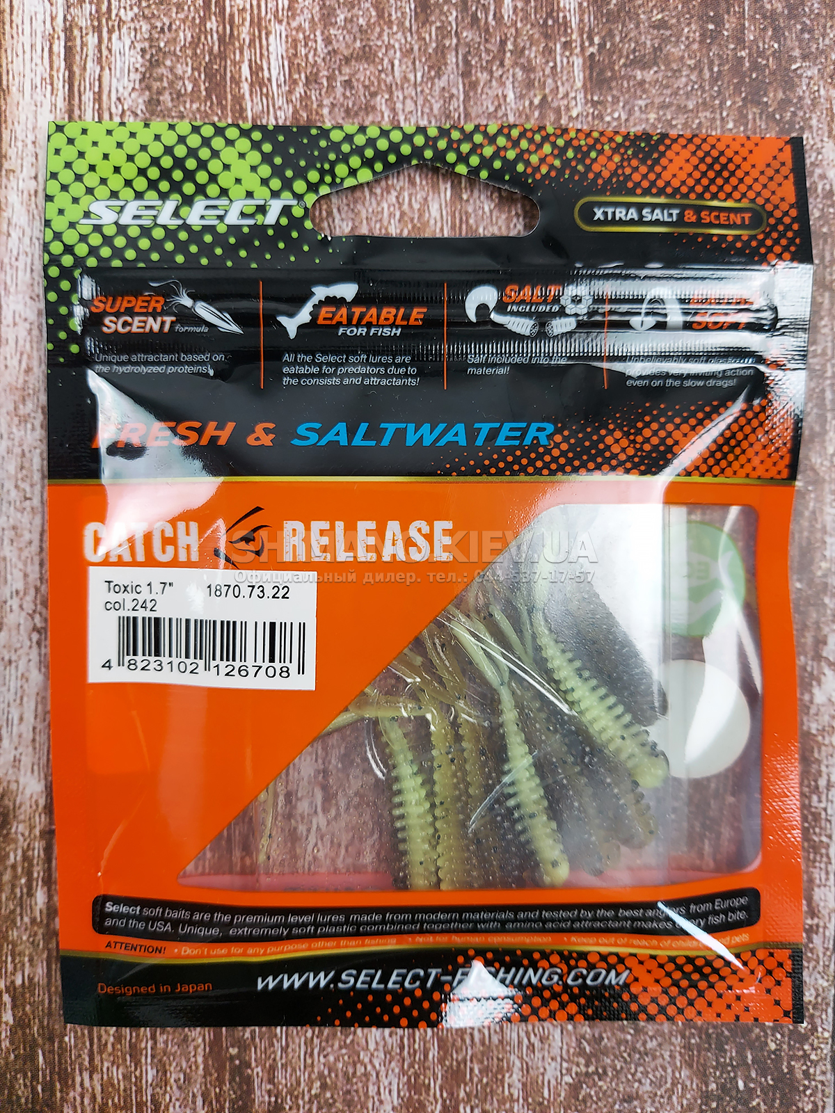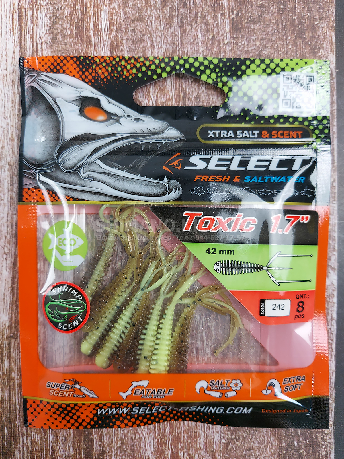 Силікон Select Toxic - це креатура, спеціально створена для лову окуня. Форма приманки являє собою ребристе тіло з довгими рухливими лапками і коротким хвостом. Анімувати Toxic досить легко - приманка дуже еластична і рухома, тому моментально реагує на будь-які рухи вершинкою вудилища. Лапки починають ворушитися від найменших маніпуляцій, а на паузі, після чергової джигової сходинки, вони ще якийсь час повертаються в початкове положення, саме в цей момент дуже часто і відбувається клювання бажаного окуня. Ясна річ, що рівномірка не коник цієї креатури, а от різноманітні посмикування і потяжки в придонному шарі - це якраз те, що потрібно. Також ця приманка добре себе проявляє на повільному волочінні по дну. Кращий монтаж, звичайно ж, - це класичний шарнір або джиг-ріг, а також варто відзначити і результативну ловлю на відвідний поводок.Якщо купити силікон Select Toxic, то можна ловити смугастого круглий рік, головне правильно підібрати вагу монтажу та подачу приманки. Використовуючи більш важкі грузила, можна спокійно обловлювати глибші місця в пошуках судака.
