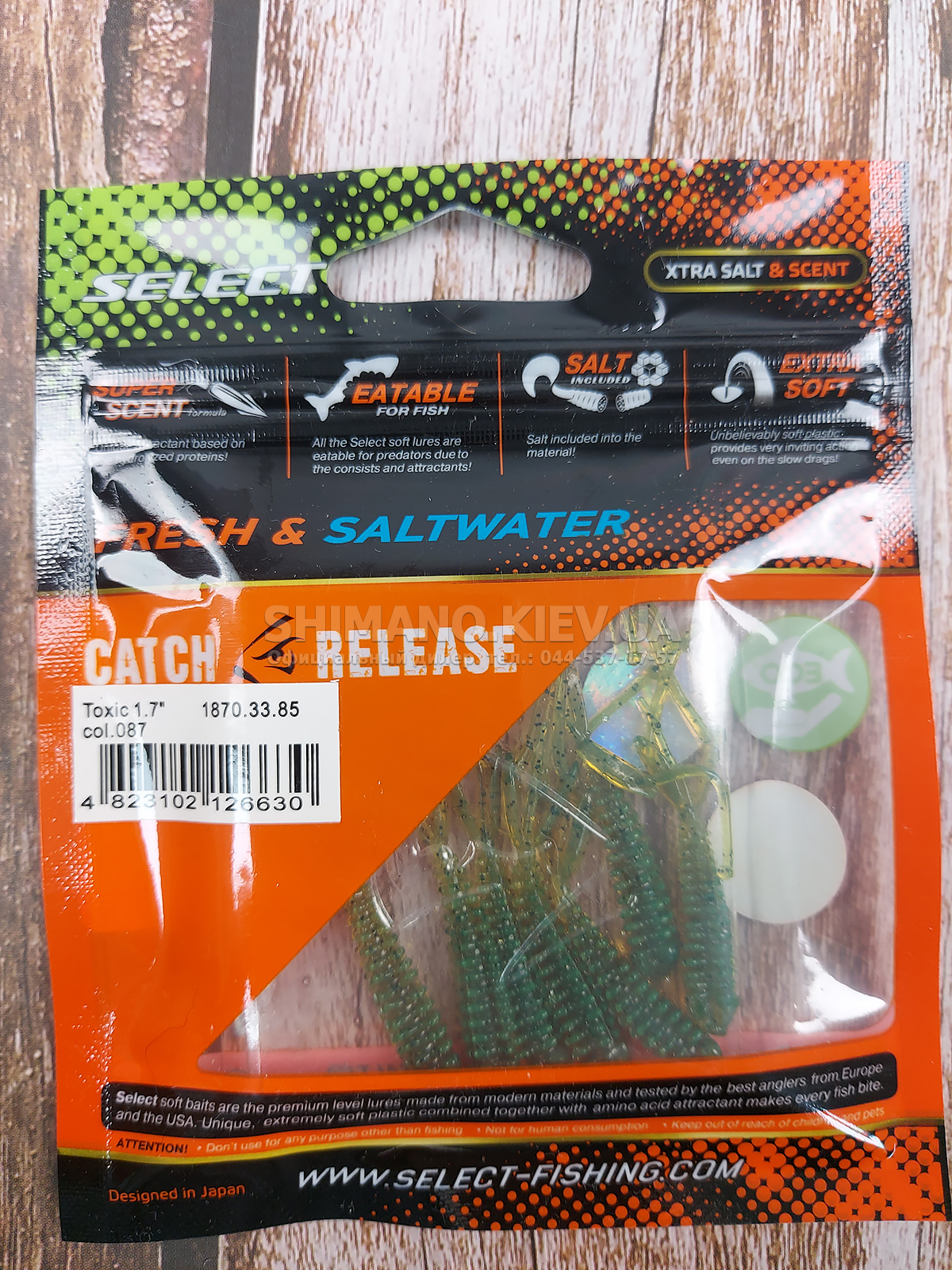 Силікон Select Toxic - це креатура, спеціально створена для лову окуня. Форма приманки являє собою ребристе тіло з довгими рухливими лапками і коротким хвостом. Анімувати Toxic досить легко - приманка дуже еластична і рухома, тому моментально реагує на будь-які рухи вершинкою вудилища. Лапки починають ворушитися від найменших маніпуляцій, а на паузі, після чергової джигової сходинки, вони ще якийсь час повертаються в початкове положення, саме в цей момент дуже часто і відбувається клювання бажаного окуня. Ясна річ, що рівномірка не коник цієї креатури, а от різноманітні посмикування і потяжки в придонному шарі - це якраз те, що потрібно. Також ця приманка добре себе проявляє на повільному волочінні по дну. Кращий монтаж, звичайно ж, - це класичний шарнір або джиг-ріг, а також варто відзначити і результативну ловлю на відвідний поводок.Якщо купити силікон Select Toxic, то можна ловити смугастого круглий рік, головне правильно підібрати вагу монтажу та подачу приманки. Використовуючи більш важкі грузила, можна спокійно обловлювати глибші місця в пошуках судака.