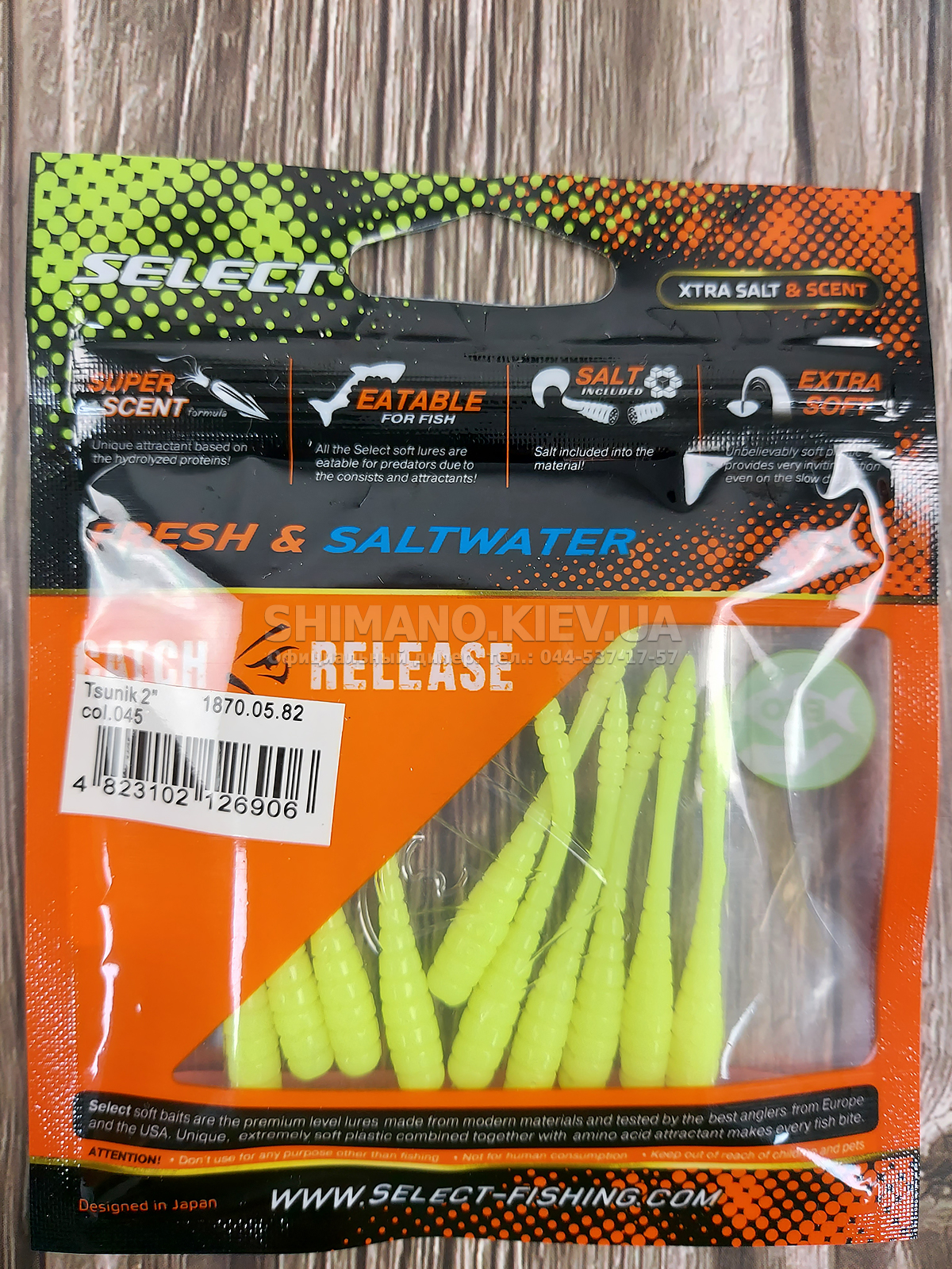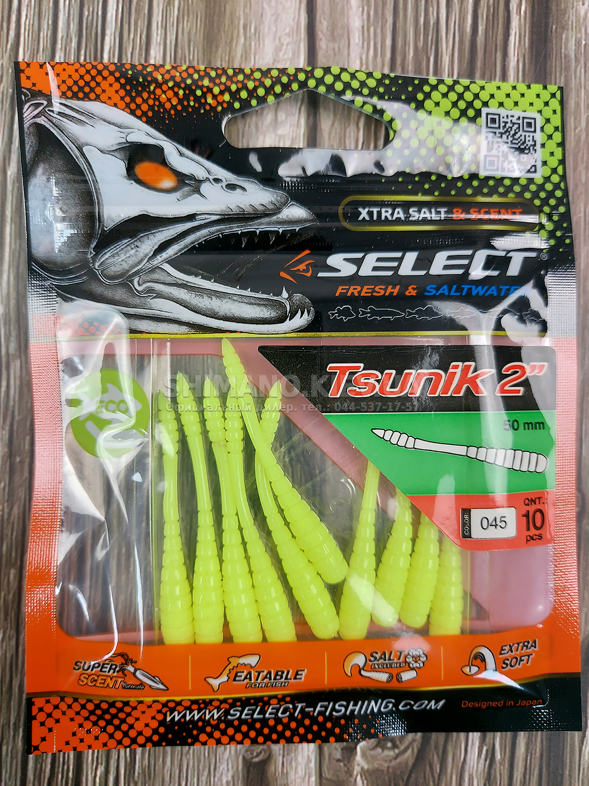 Силікон Select Tsunik – ультралайтова приманка, повз яку не пройде жодний хижак. Кінчик хвоста хробака наділений потовщенням, відповідно вага його збільшилася. Такий параметр надає приманку оригінальною грою. Рекомендується оснащувати приманку л