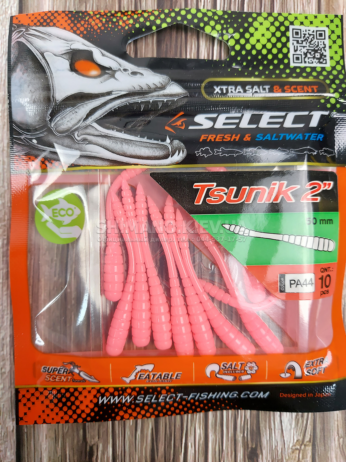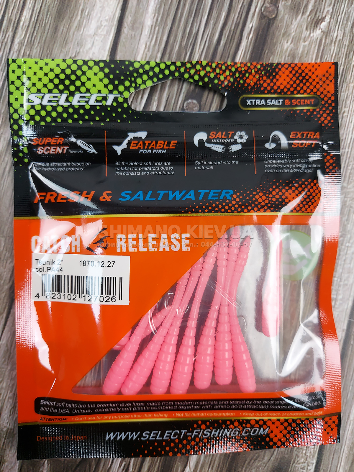Силікон Select Tsunik – ультралайтова приманка, повз яку не пройде жодний хижак. Кінчик хвоста хробака наділений потовщенням, відповідно вага його збільшилася. Такий параметр надає приманку оригінальною грою. Рекомендується оснащувати приманку л