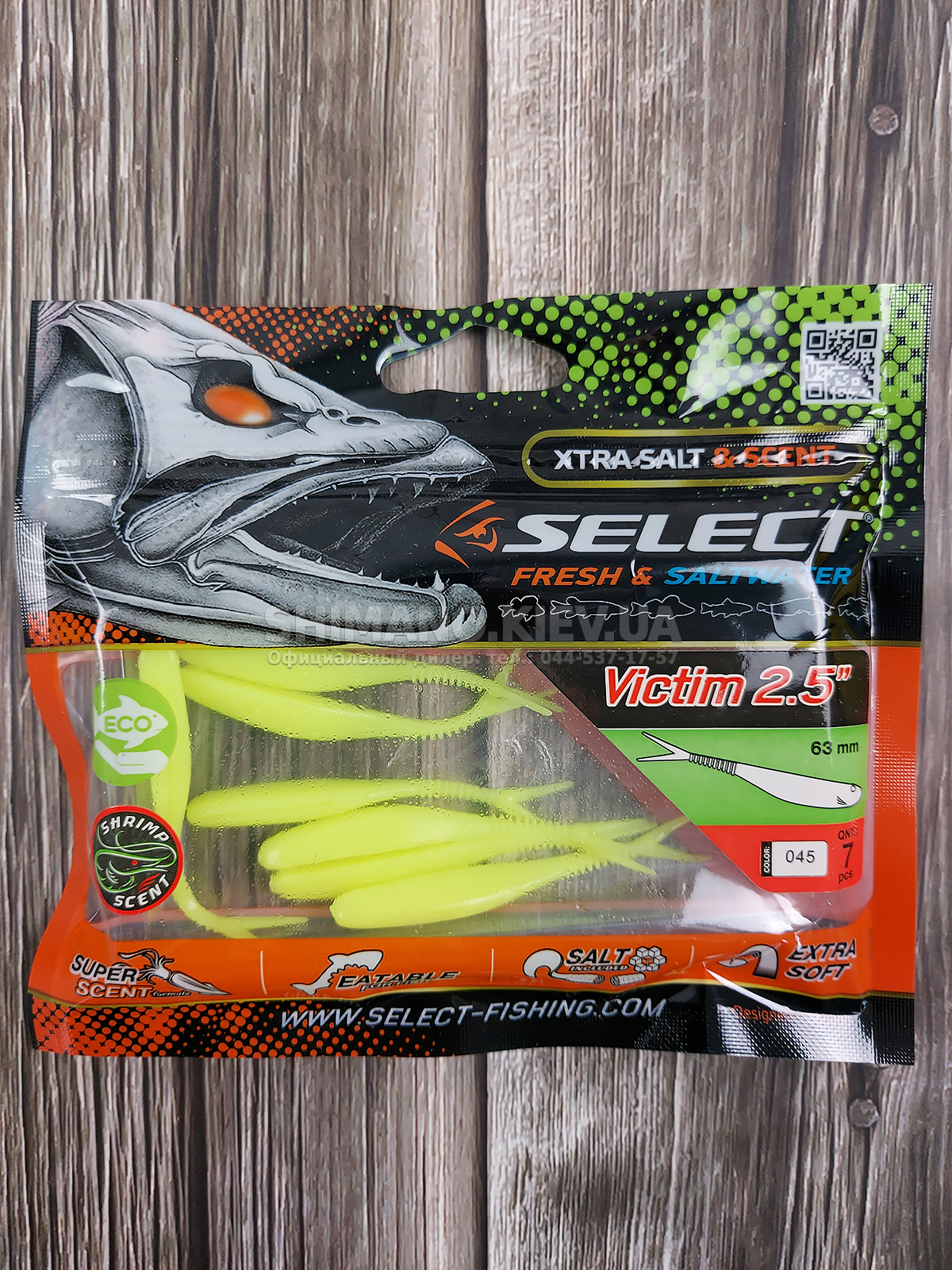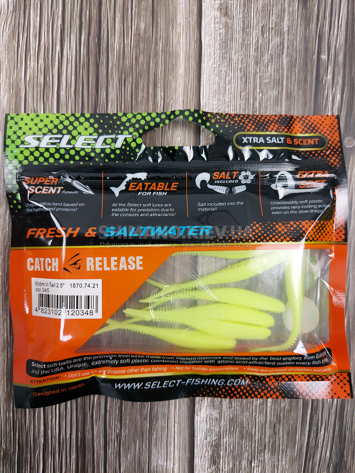Силікон Select Victim V-Tail являє собою класичний слаг з V-подібним хвостом. Ребристе стерно хвоста сприяє збільшенню його міцності без шкоди рухливості. Приманка може оснащуватися на багато видів монтажів та різні типи гачків. Силікон ефективно працює при використанні, джигової техніки, дроп-шоту та повідцевого оснащення. Для підвищення ефективності ступінчастої проводки рекомендується у паузах виконувати похитування вершиною вудлища, що особливо провокує пасивну рибу. Додані до складу матеріалу сіль та атрактант збільшують привабливість приманки, оскільки вона залишає ароматний шлейф у воді та при обережному клюванні риба, відчуваючи їстівний смак, більш охоче захоплює слаг. Лінійка Victim V-Tail включає кілька розмірів від невеликих 2.5 дюймових до досить великих довжиною 6 дюймів. Така різноманітність дозволяє підібрати оптимальний варіант під певні види риби, а широка гама цікавих забарвлень ще більше підвищує ефективність у певних умовах на риболовлі.